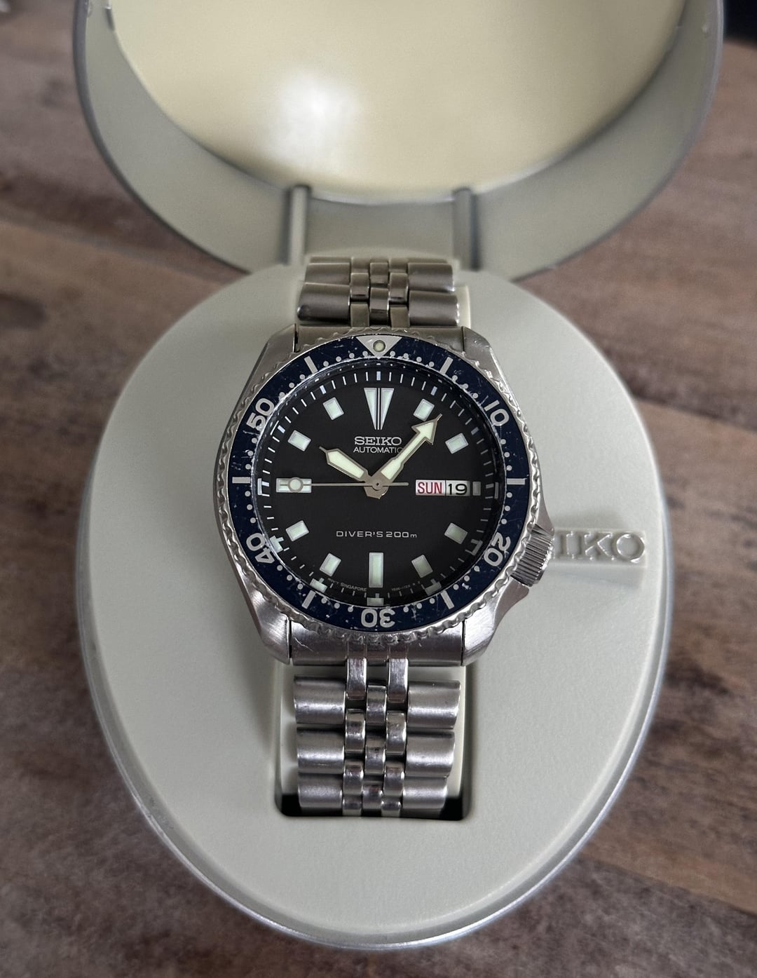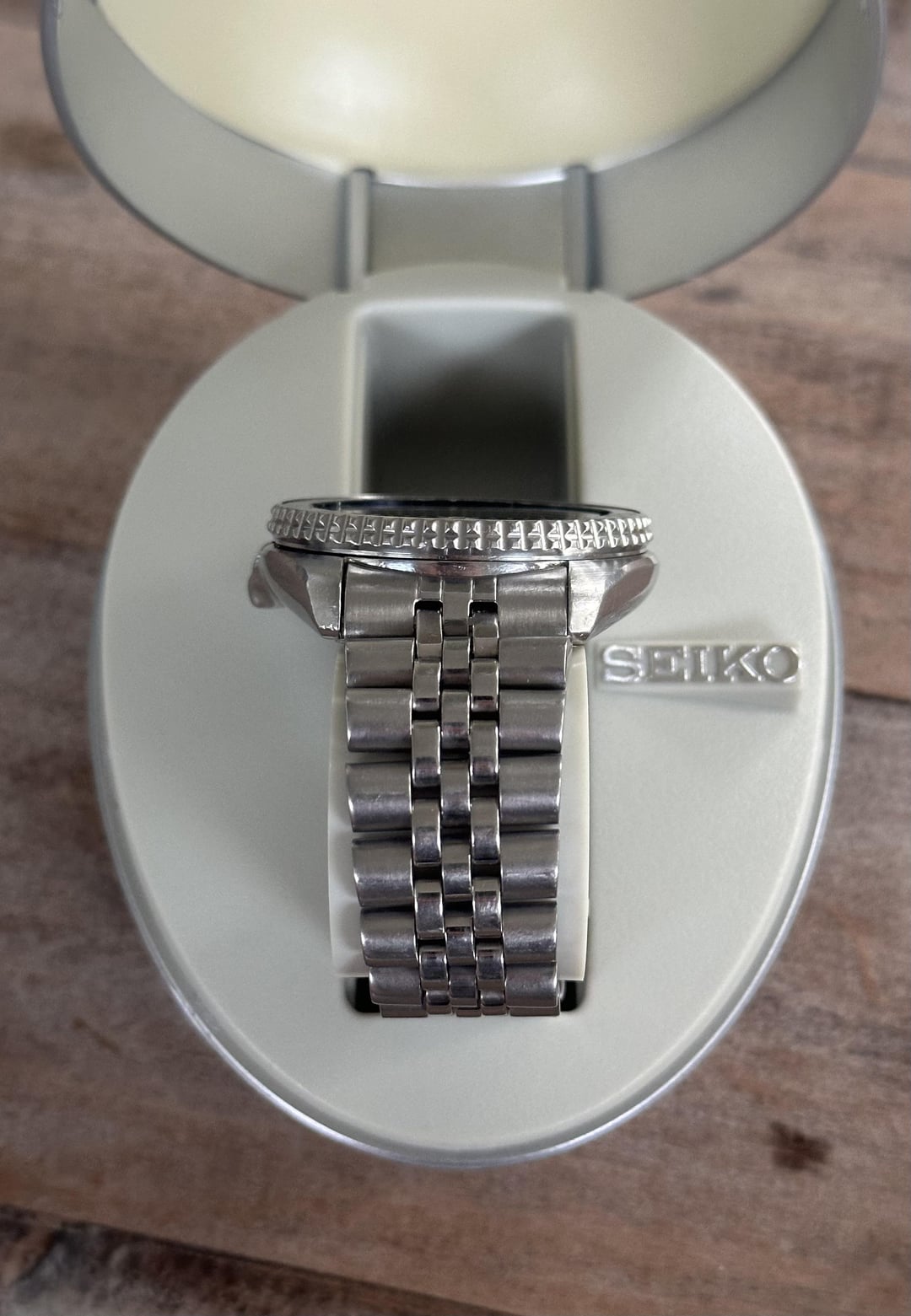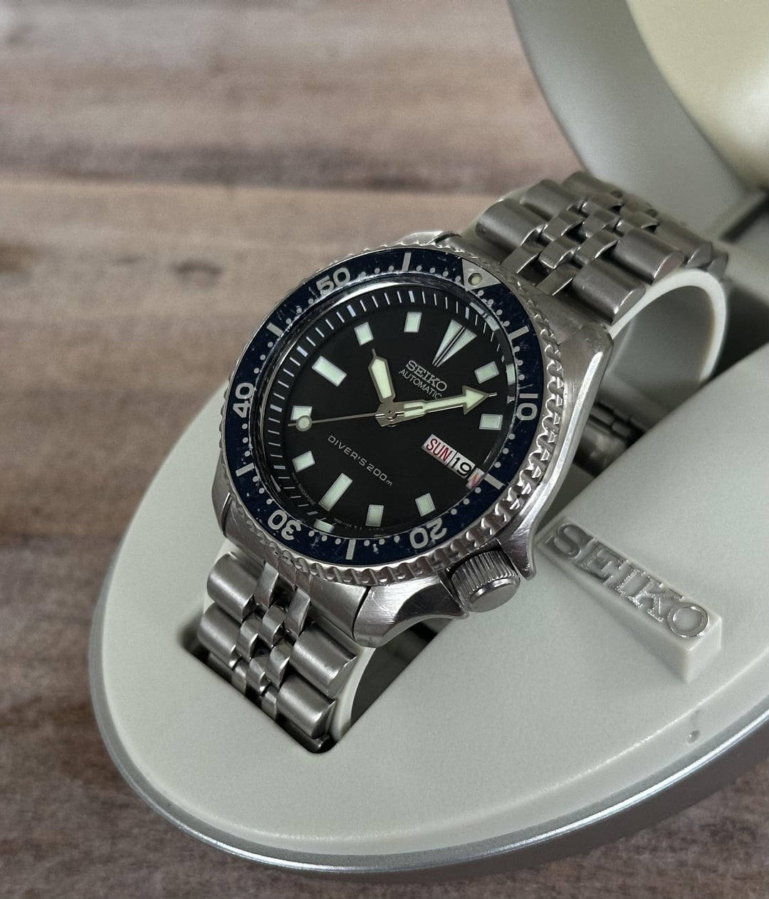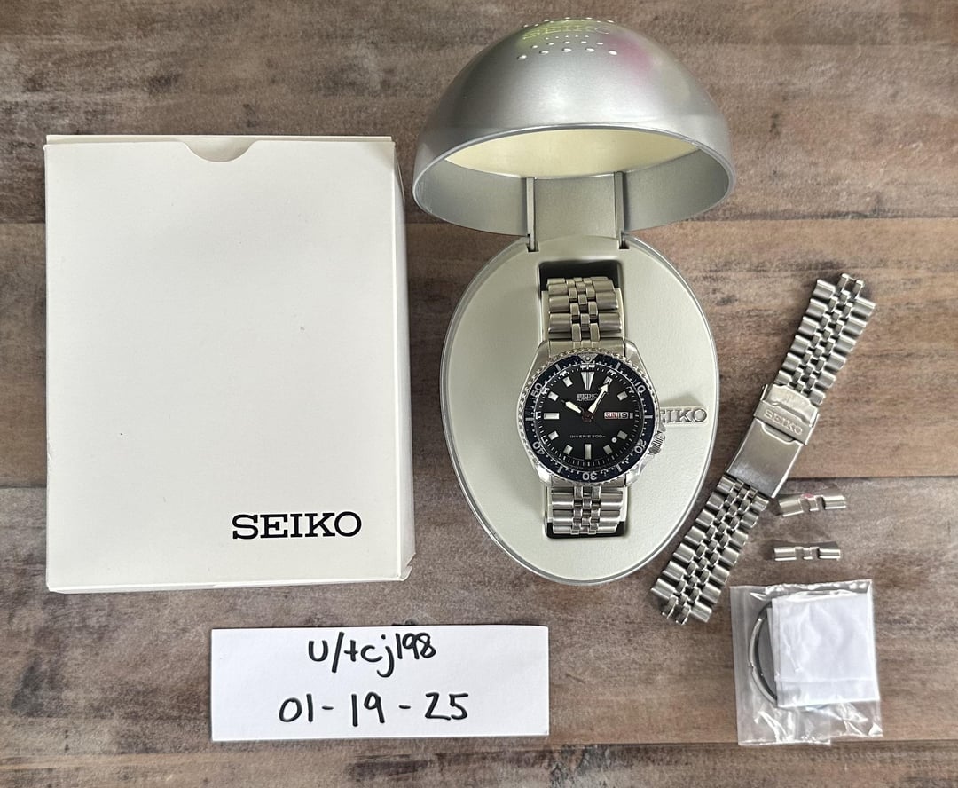 For sale is a well-loved 2003 Seiko SKX173 Diver. I acquired this watch from the original owner and had it fully serviced in October 2024, ensuring its functionality while maintaining its original character. This SKX remains 100% original, with no aftermarket parts, and the service was performed here in the U.S. This is definitely not a Franken-Seiko restoration often seen for this year range SKX. Details: • Movement: The original 7S26A movement was fully serviced and runs flawlessly. • Crown: Original crown with a fresh gasket. Screws down smoothly with multiple full rotations. • Crystal: A NOS genuine Seiko Hardlex crystal was installed (the original crystal is included). • Bezel: Rotates smoothly with well-defined clicks. The insert shows an awesome patina that appears navy blue in certain lighting. • Gaskets: All gaskets have been replaced. • Bracelets: Includes an OEM Seiko Jubilee bracelet in matching condition, plus an additional bracelet for spare links or parts. Combined, the links should fit wrists up to approximately 7.5 inches. This SKX173 combines neo-vintage charm with the modern reliability needed for everyday wear. Price is $250 (PP FF, Zelle) shipped. Feel free to reach out with any questions. Thanks for looking!