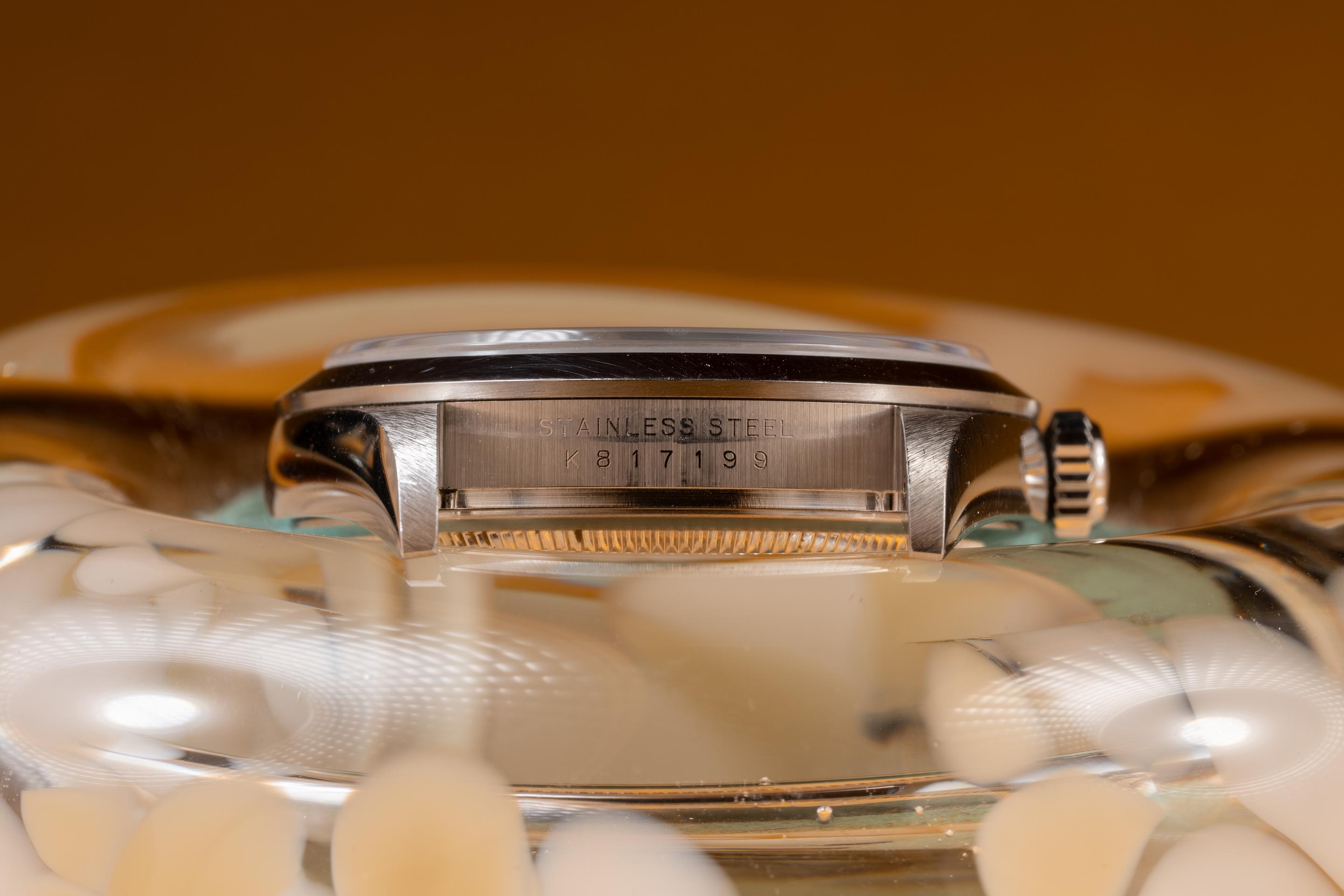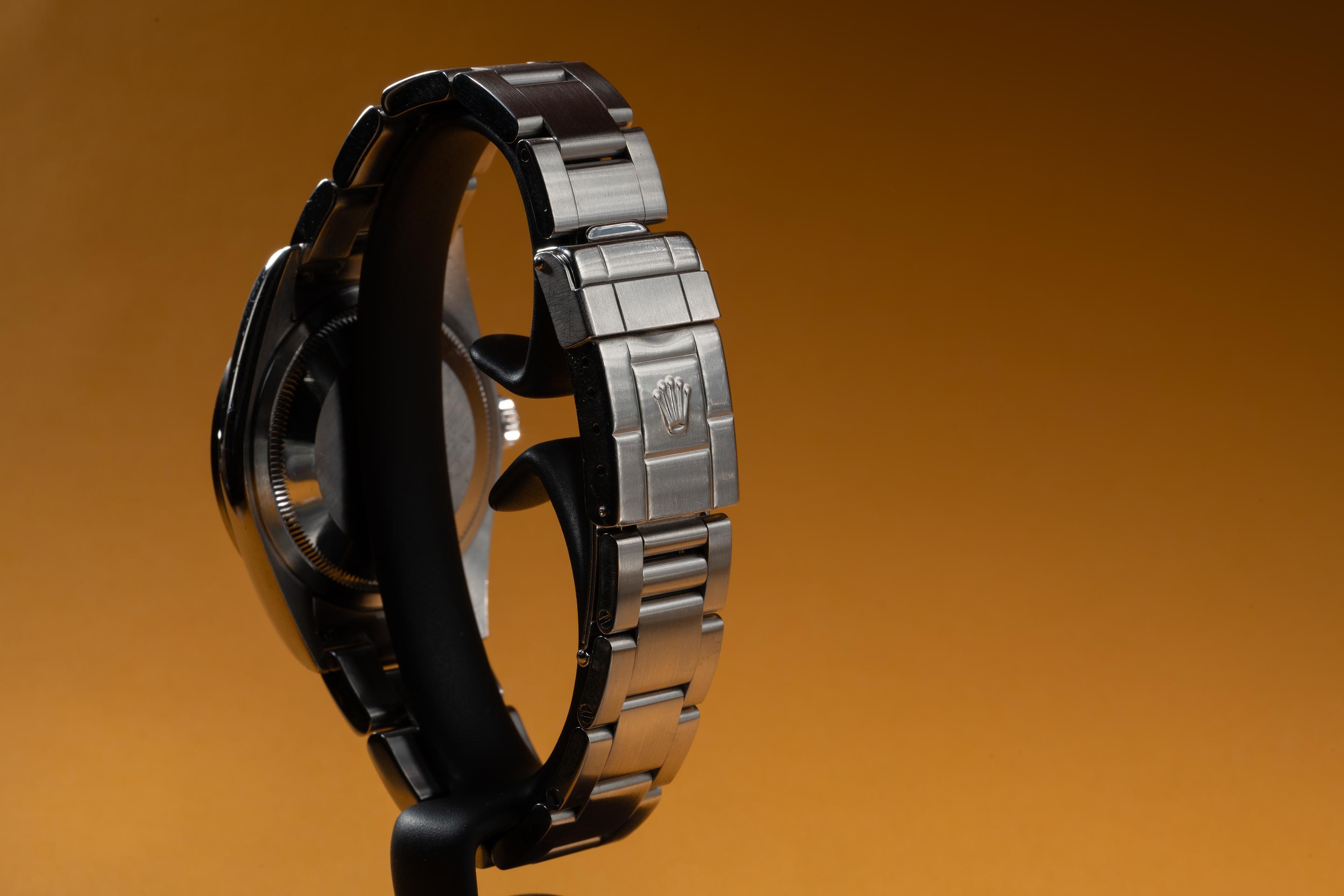Description: Case: The 36mm case is excellent showing some light wear from use. The smooth stainless bezel is also in excellent condition showing some light wear from use. Dial: The glossy black 3, 6, 9 dial is excellent showing no visible wear. The original factory hands are matching. Bracelet: The 12 link Oyster bracelet is excellent showing only very light stretch for its age. The clasp is stamped with a matching 2001 date code. Accessories: None.