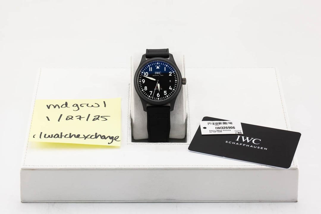 Up for sale is an unworn condition IWC Pilot's Watch Automatic Top Gun 41mm on rubber strap, reference # IW326906. It comes complete with all boxes, papers, booklets, hang tag and IWC Warranty Card dated January 2025. Unworn Condition / Complete Set **Item Details:** IWC Pilot's Watch Automatic Top Gun 41mm Ceramic Case IWC 32111 Calibre Movement **Timestamp:** [https://live.staticflickr.com/65535/54291111426\_b41cb421b8\_b.jpg](https://live.staticflickr.com/65535/54291111426_b41cb421b8_b.jpg) **Trades:** We are cash buyers and will consider all modern trades. **Payment:** Listed Price is for Bank Wire, Zelle or any no-fee payment method. Paypal is an additional 3.5%. **Price:** $5350 - Shipped 2 Day Air ! **Shipping:** Fedex Express within the US. International Shipping adds $150. **Returns:** Returns accepted within 48 hours of receipt only if the watch is misrepresented. **Contact:** Please email or text for fastest response. [[email protected]](mailto:[email protected]) or call / text 207-209-4000 Buying a watch on the internet can be scary. We know. You want an established business, accurate presentation of product, followed up by quick responses, and expedited shipping. We understand. That is why we deliver this along with honest, straightforward transactions backed by our well-built reputation. We are new to Reddit but have been selling on forums for many years, and have literally thousands of references. All photography is original. 6.625% state sales tax applies to New Jersey shipping addresses only.