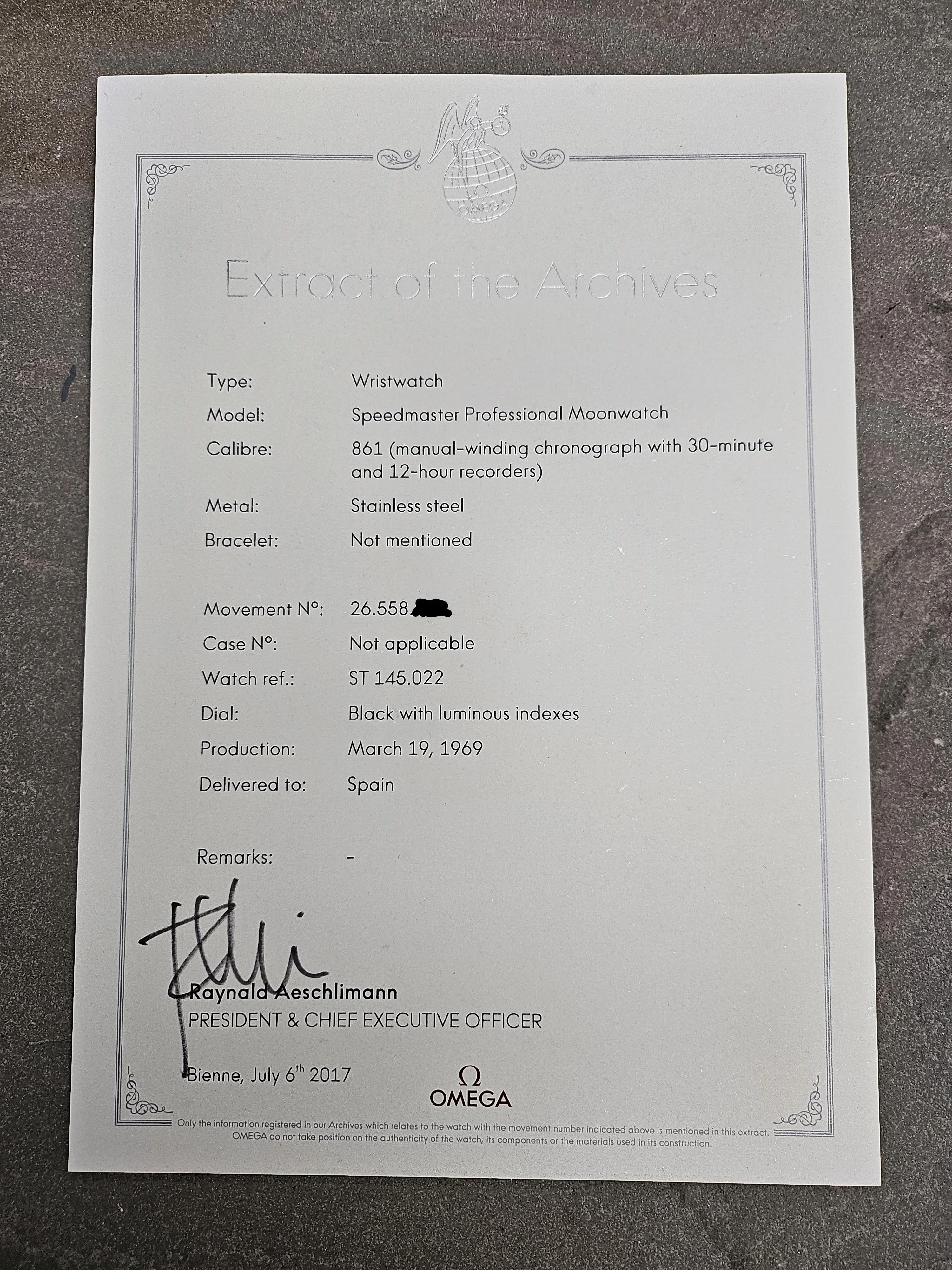 Caseback in good condition with sharp hippocampus. The watch comes with a period correct 1039 bracelet dated 4/70 with tight links and genuine Omega #516 end links. The watch runs and resets as it should. Date of last service unknown. The watch was originally delivered to Spain in 1969 (Extract of the Archives included in sale).