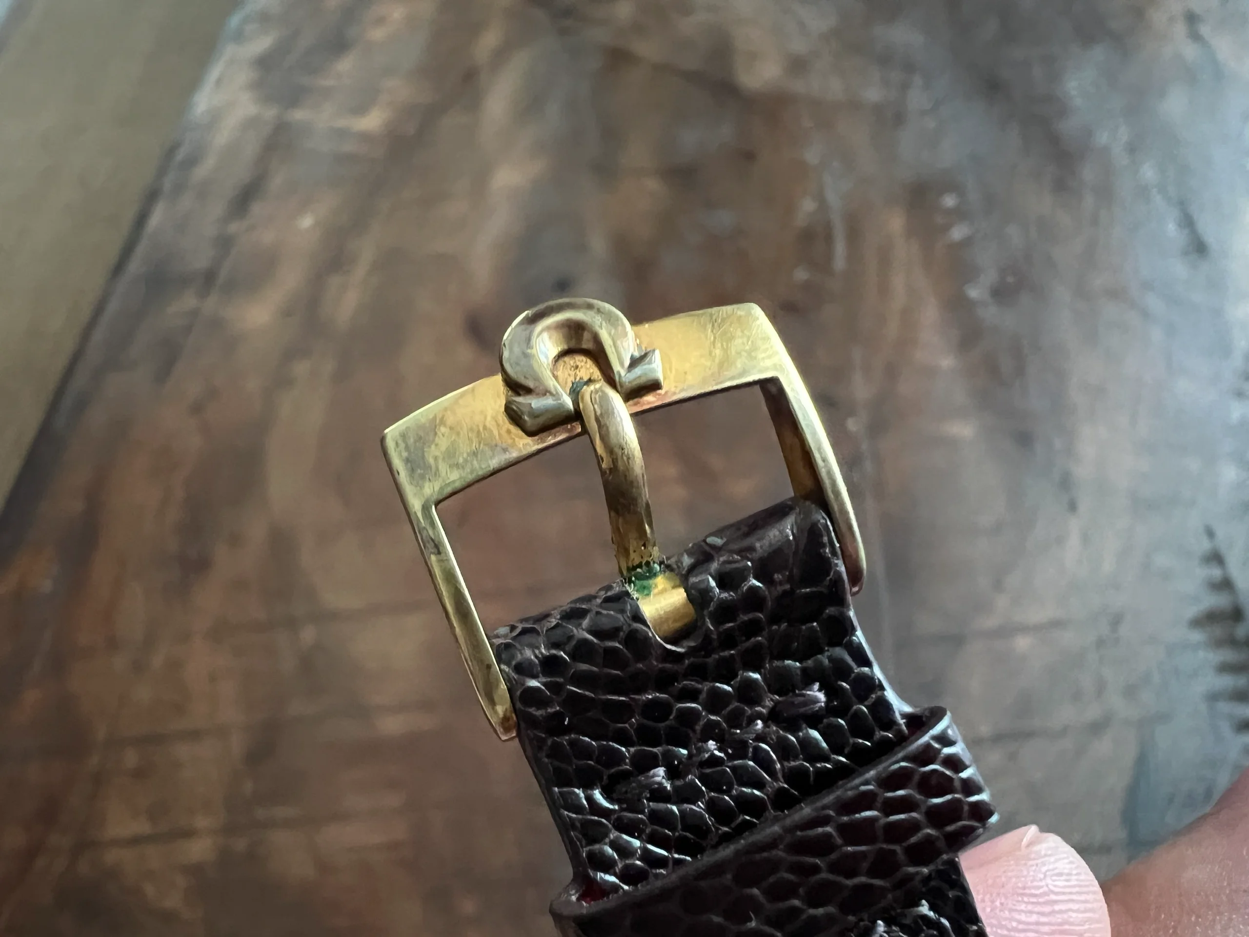 Buckle: Original and period-correct Omega gold-plated buckle.