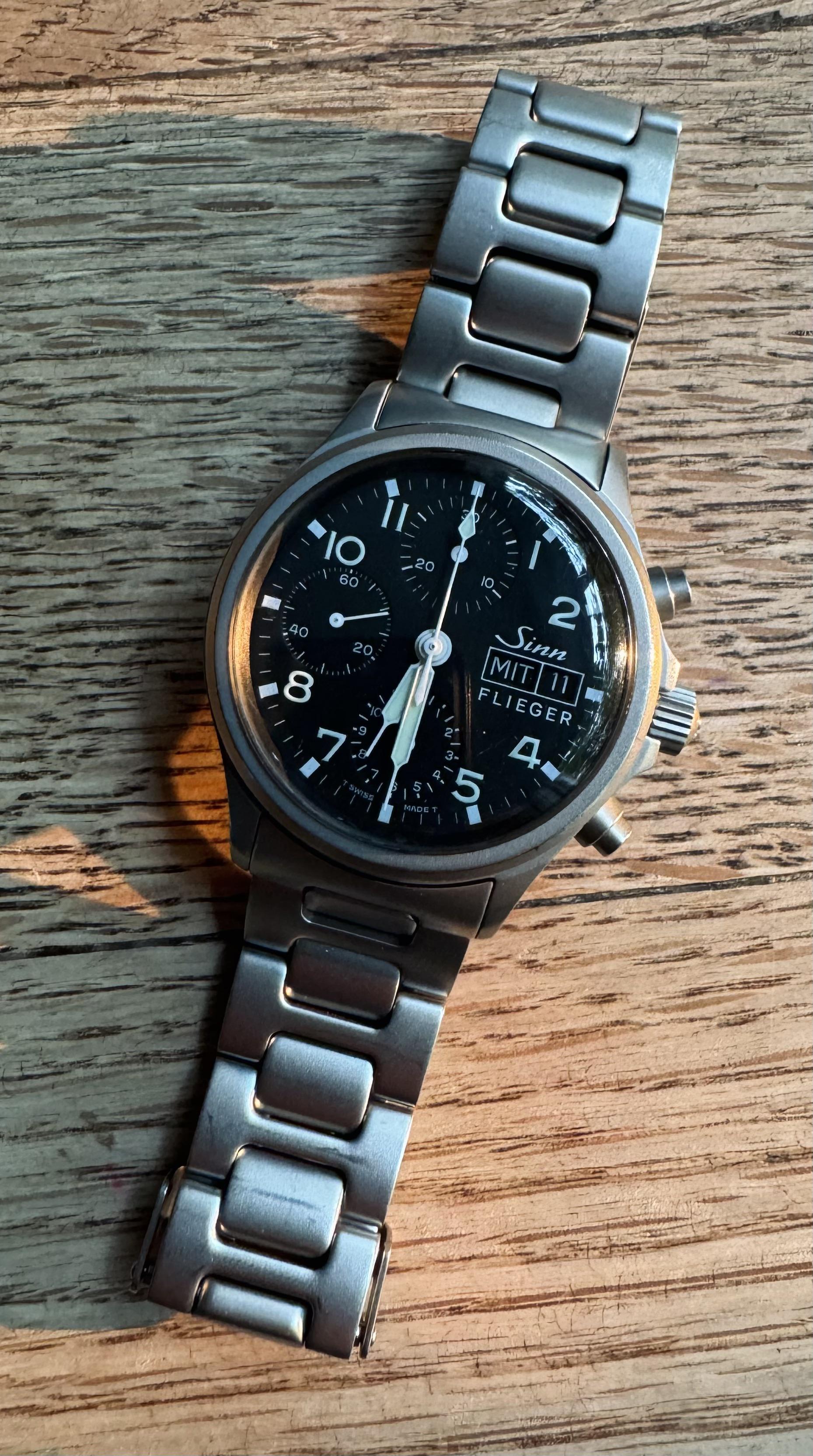 For sale is my Sinn 356. The 356 is a classic Valjoux 7750 powered 38.5mm chronograph. This one was produced in 1998 with sales receipt from 2007. This is the acrylic crystal version and features Sinn’s bead blasted case and bracelet (this initial run of 356 used a brushed caseback). There are normal marks on the case and bracelet but I’d rate it as good condition (typical marks on the clasp from use). The T Swiss (tritium) dial is super rare (I’ve only ever seen one other) just starting to turn a creamy tone, but also shines very bright at night (and holds charge reasonably well). German only day wheel and brushed caseback on this. I had the watch serviced by Aaron Recksiek at Mt Olympus Clocks in Utah. Full movement and case service, new Acrylic crystal and crown from Sinn. Runs at around -3s/day on wrist (service was done in spring of 2023). Under a loupe, you can see a couple tiny black marks on the dial on the 6oclock sub register, from where the hand was popped off. It literally took me a year to notice it, but I wanted to call this out. Includes full kit, inner and outer box, warranty card, extra links for bracelet (currently sized for around 6.75” wrist). The 356 is an absolute classic, but one with Tritium dial, 7750 Movement, brushed caseback, makes this next level - way cooler than any of the new versions IMO. Grail on radar so pricing to move. $1800 plus shipping. no trades, selling within CONUS. [photos and timestamp](https://imgur.com/a/BWk1KsI)