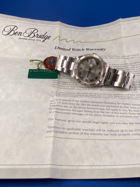 THIS WATCH WILL COME WITH THE ORIGINAL ROLEX INNER BOX, THE ORIGINAL ROLEX FACTORY WARRANTY CERTIFICATE, ROLEX OYSTER BOOKLET, ROLEX INTERNATIONAL WARRANTY BOOKLET, GREEN ROLEX HANG TAG, RED ROLEX HANG TAG, A GREEN LEATHER ROLEX WALLET, THE BEN BRIDGE STORE WARRANTY CERTIFICATE, AND OUR IN HOUSE ROLEX OWNERS CERTIFICATE AS SHOWN IN THE PHOTOS.