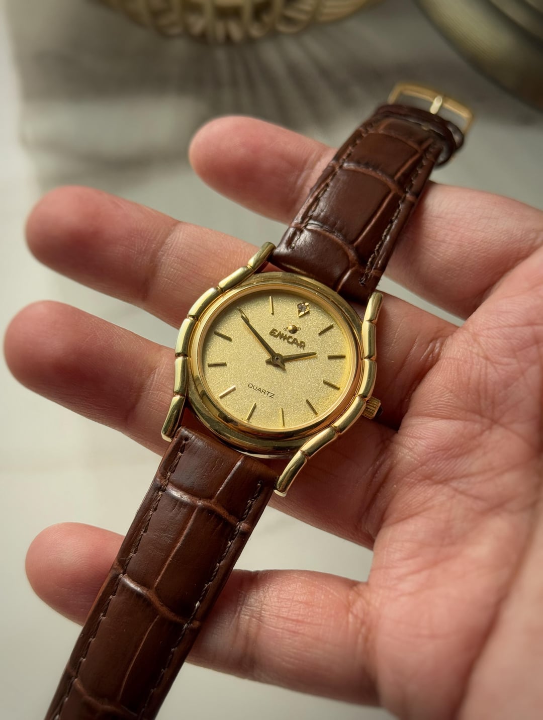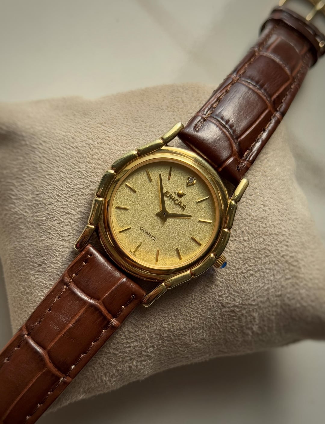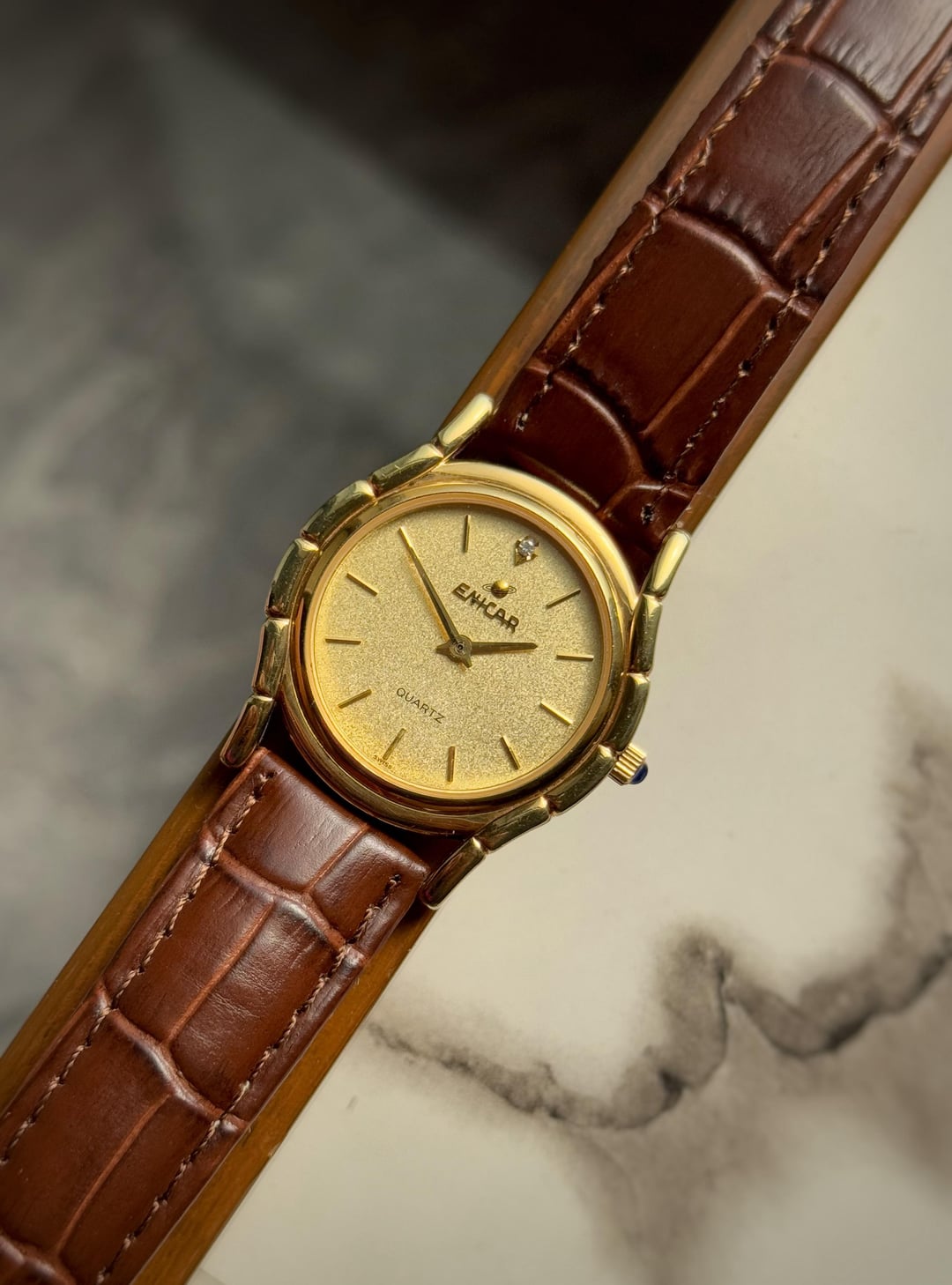 [WTS] Enicar Gold Dust Dial, Beautiful Case Shape only for 135$ Shipped 🚢 (Via FedEx) Up for sale is a enicar made in switzerland featuring a stainless steel/gold plated case with a case size of 33x39mm. Condition of the case is good, no major dents or dings just a few hairline scratches overall. Dial is clean with no signs of aging. Sapphire Crown. Comes on an aftermarket brown crocodile leather strap with a standard golden buckle. Quartz movement working perfectly fine with no malfunctions and keeping accurate time. Watch only! Asking 135$ 🚢 via Fedex Payment through Wise/PayPal F&F Will be shipped by the weekend