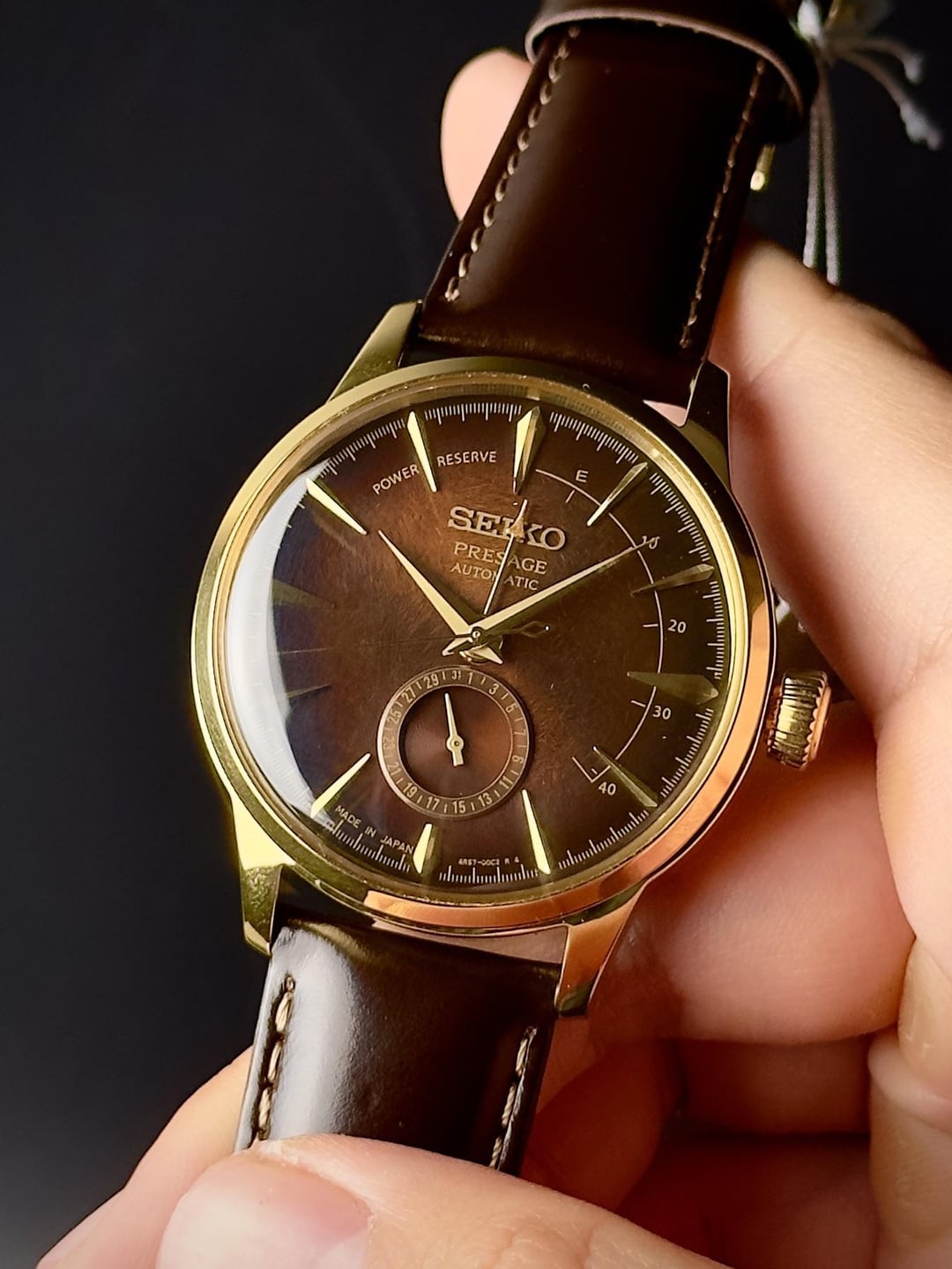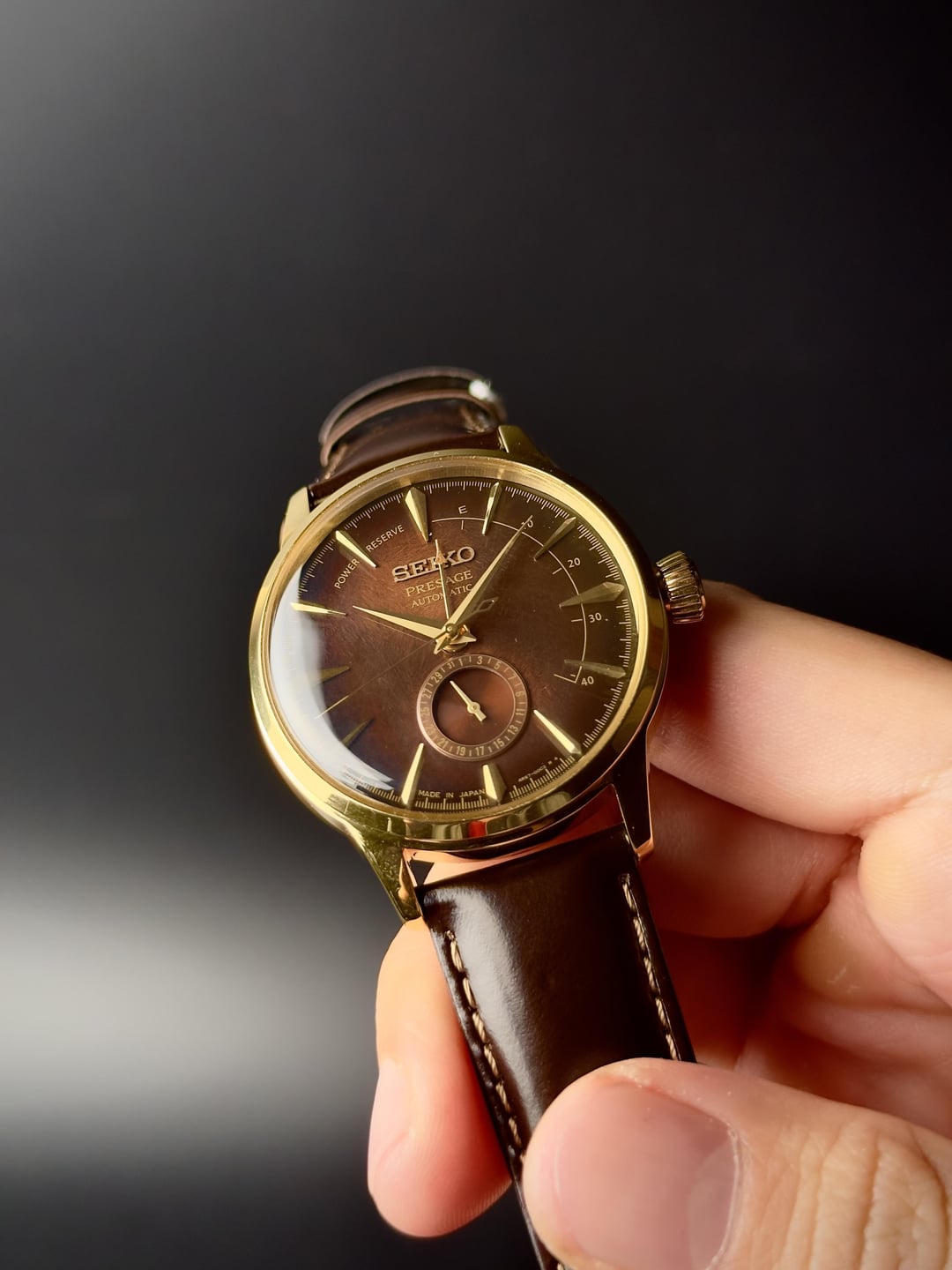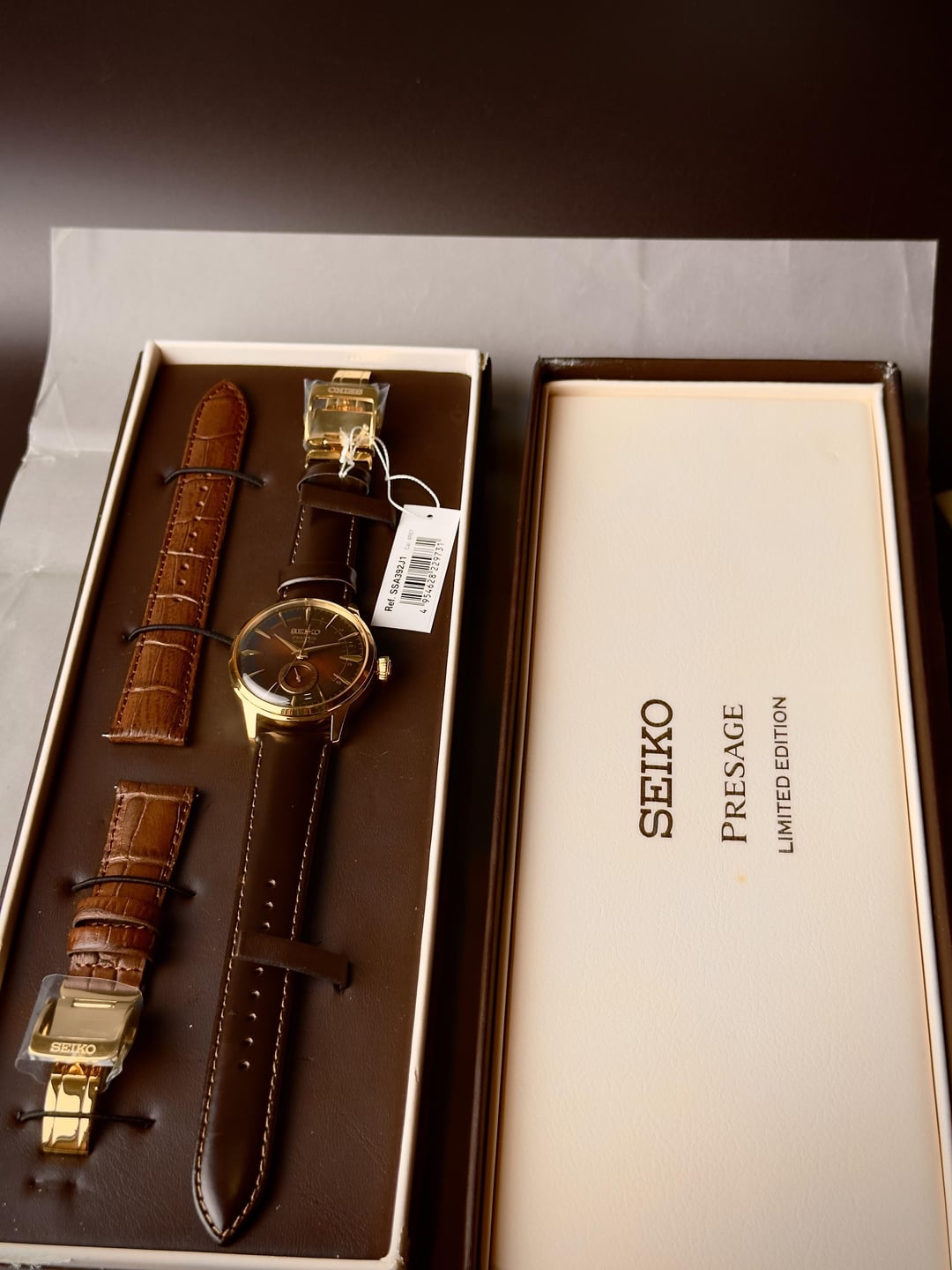 Up for sale is the Seiko Presage Old Fashioned Power Reserve Limited Edition lmt 8000 pieces SSA392J1 in near mint condition Images: https://imgur.com/a/JnsM5Xq Timestamp: https://imgur.com/a/MiLQyZa The Seiko Presage Old Fashioned Power Reserve Limited Edition SSA392J1 is a tribute to classic cocktails, blending vintage aesthetics with refined craftsmanship. Limited to 8,000 pieces, this watch is part of Seiko’s Cocktail Time series, inspired by the rich amber tones of an Old Fashioned. Design & Aesthetic The dial is a deep, warm brown with a subtle sunburst effect, mimicking the hue of whiskey in a glass. The textured finish adds depth, while the gold-tone hands and indices enhance its classic, sophisticated appeal. The power reserve indicator, positioned between 12 and 4 o’clock, resembles the measurement markings on a bar tool, adding to its thematic charm. Case & Dimension - Case Diameter: 40.5mm - Case Thickness: 14.4mm - Lug Width: 20mm - Crystal: Box-shaped Hardlex - Case Material: Stainless steel with a gold-tone finish - Water Resistance: 50m Movement & Functionality - Caliber: Seiko 4R57 Automatic - Power Reserve: ~41 hours - Power reserve indicator - Date subdial at 6 o’clock - Exhibition case back showcasing the movement I picked this one up back in 2022 at retail for nearly $700, but I never actually wore it. The only thing I did was remove the caseback seal—otherwise, it’s been sitting untouched. It’s in pristine condition and comes as a full set. Price: $560 + shipping. Payment via PayPal F&F or G&S (buyer covers +4.4% fee). No trades please. Feel free to message me with any questions or if you’re interested. Have a great day! See more of my watches on instagram: @jasonswatchcorner