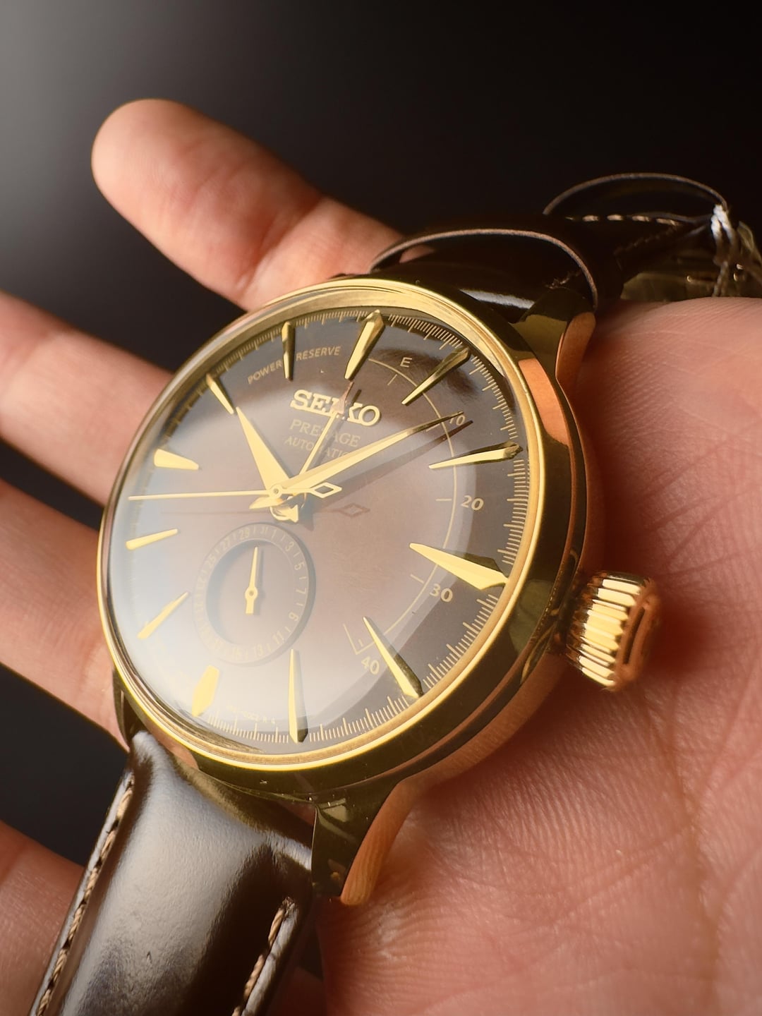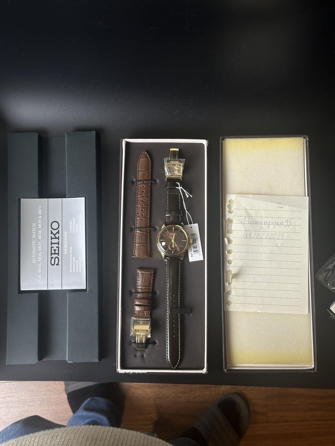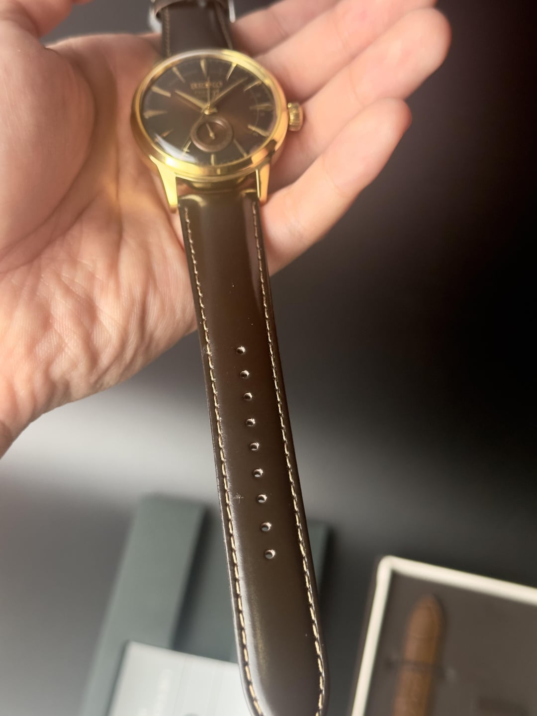 Up for sale is the Seiko Presage Old Fashioned Power Reserve Limited Edition lmt 8000 pieces SSA392J1 in near mint condition Images: https://imgur.com/a/JnsM5Xq Timestamp: https://imgur.com/a/MiLQyZa The Seiko Presage Old Fashioned Power Reserve Limited Edition SSA392J1 is a tribute to classic cocktails, blending vintage aesthetics with refined craftsmanship. Limited to 8,000 pieces, this watch is part of Seiko’s Cocktail Time series, inspired by the rich amber tones of an Old Fashioned. Design & Aesthetic The dial is a deep, warm brown with a subtle sunburst effect, mimicking the hue of whiskey in a glass. The textured finish adds depth, while the gold-tone hands and indices enhance its classic, sophisticated appeal. The power reserve indicator, positioned between 12 and 4 o’clock, resembles the measurement markings on a bar tool, adding to its thematic charm. Case & Dimension - Case Diameter: 40.5mm - Case Thickness: 14.4mm - Lug Width: 20mm - Crystal: Box-shaped Hardlex - Case Material: Stainless steel with a gold-tone finish - Water Resistance: 50m Movement & Functionality - Caliber: Seiko 4R57 Automatic - Power Reserve: ~41 hours - Power reserve indicator - Date subdial at 6 o’clock - Exhibition case back showcasing the movement I picked this one up back in 2022 at retail for nearly $700, but I never actually wore it. The only thing I did was remove the caseback seal—otherwise, it’s been sitting untouched. It’s in pristine condition and comes as a full set. Price: $560 + shipping. Payment via PayPal F&F or G&S (buyer covers +4.4% fee). No trades please. Feel free to message me with any questions or if you’re interested. Have a great day! See more of my watches on instagram: @jasonswatchcorner