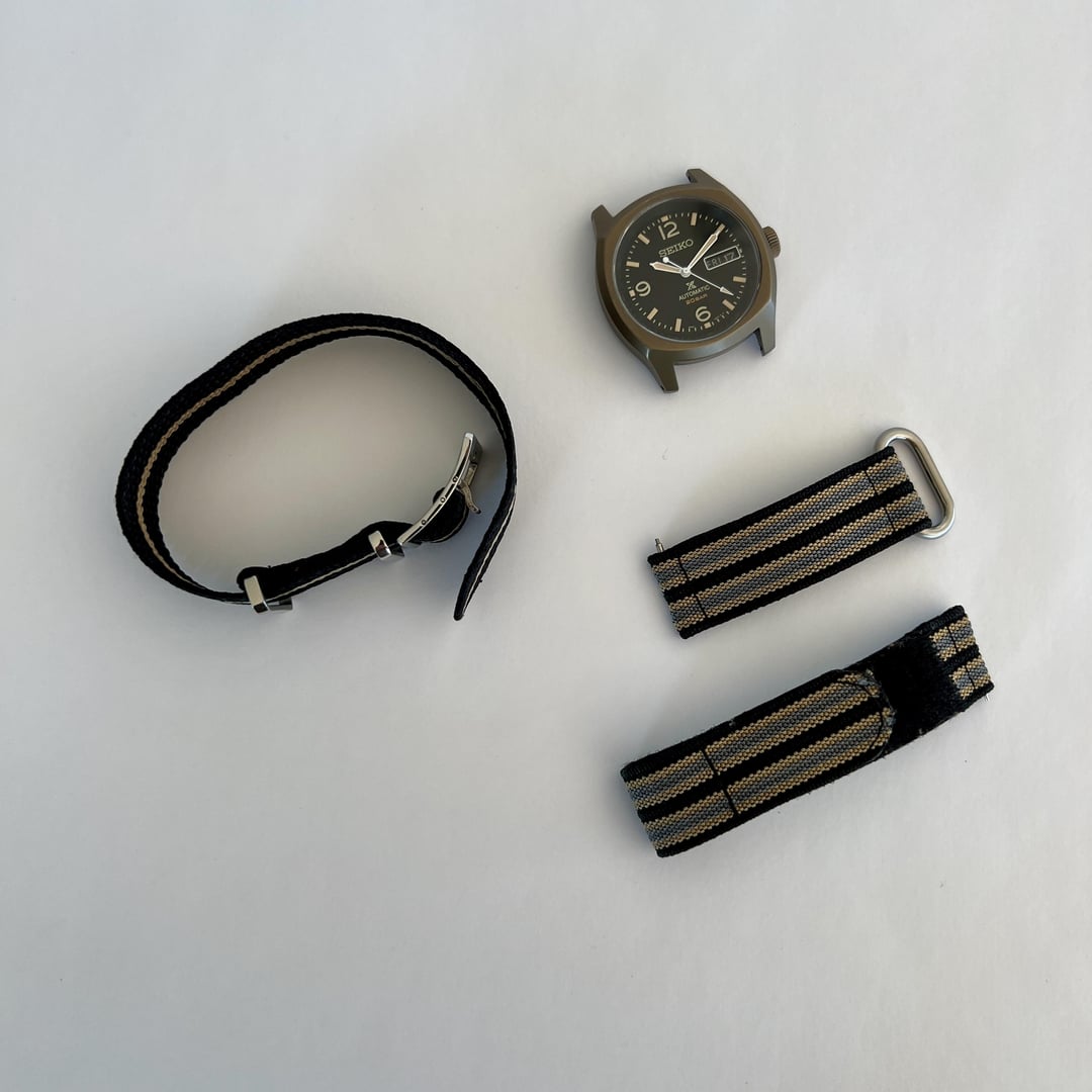 Very cool Seiko 5 mod bought here in April. Full disclosure: I cannot find the original post that describes the build, and the guy who did the work seems to be off Reddit now. I will do my best to describe it, but I am not a professional watch dealer—or even very knowledgeable about Seiko mods. PRICE: $225 shipped via PayPal (G&S add 3%) or Venmo. DESCRIPTION: The case is an unusual Samurai-style field watch mod, and it houses an Explorer-style dial finished with a vintage look lume. The date is a combo Kanji/English day/date wheel. It’s incredibly pretty in person. It’s in spectacular shape, with no visible dings or scratches. On the back, you can see traces of some adhesive or gasket situation the builder used. I am told it will stand up to splashes and light-duty water, but I haven’t ever risked it. I’m including two straps: a two-piece and a NATO. Both look great with the watch. As I said, I’m not a pro, but I am happy to FaceTime?WhatsApp video so you can look at the watch. I don’t have a lot of feedback here, but I have been on Reddit a long time and value my profile. I would not jeopardize my standing in this community over a watch.