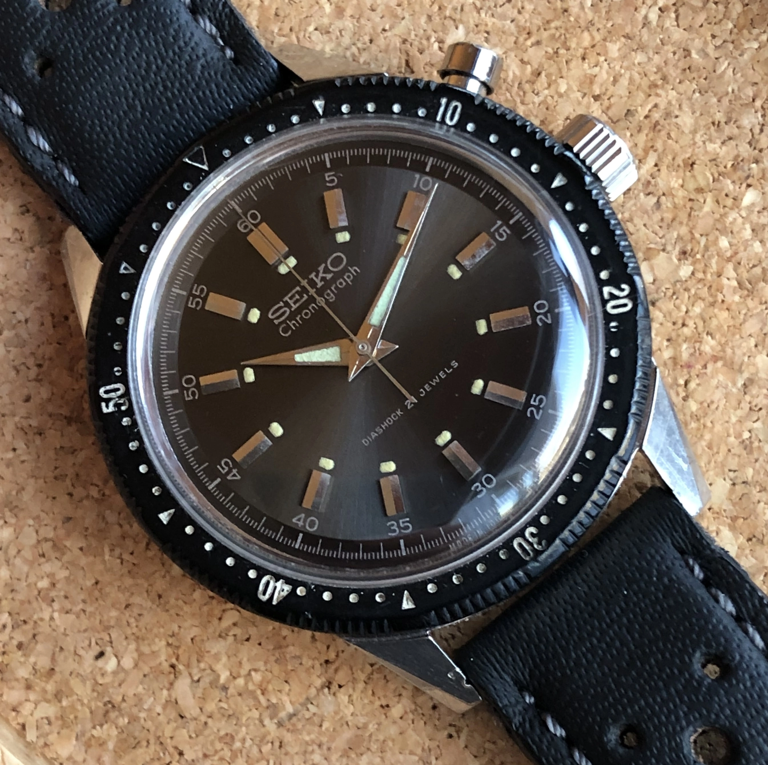 For sale is a 1964 ref 45899 hand-winding Seiko monopusher chronograph. This was Seiko's first chronograph, released for the 1964 Tokyo Olympics with the Olympic torch on the back. This is a very good example IMO, with a beautiful sunburst charcoal dial and clean lume plots and hands. Notably, the watch retains its original intact bakelite bezel (rotating smoothly), which was often replaced during service with a stainless service part. The 37mm case is extremely sharp, showing detailed and prominent chamfers. The case-back shows wear that is typical for these shallowly engraved examples. I had the watch serviced in 2021 by Vintage Time Australia (Adrian Sellick) and it is winding, setting, and running.