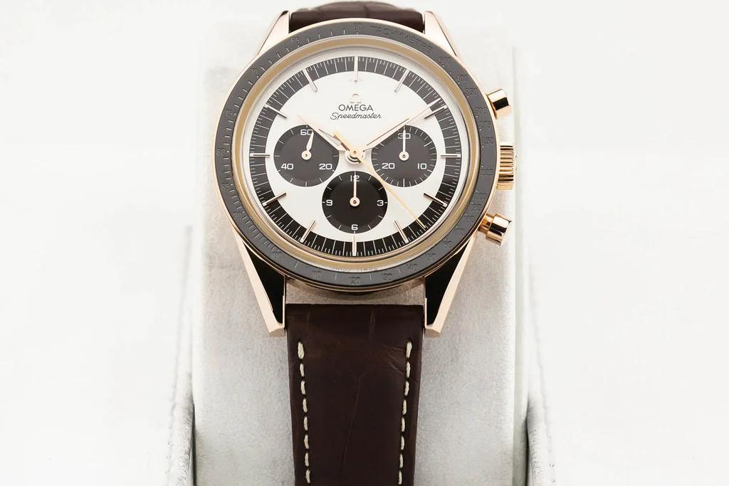 Up for sale is an excellent condition Omega Speedmaster Moonwatch First Omega In Space ( FOIS ) Numbered Edition in Sedna Gold 39.7mm Panda Dial on Leather Strap, reference # 311.63.40.30.02.001. It comes complete with all boxes, papers, booklets, hang tag and Omega Warranty Card dated March 2019.