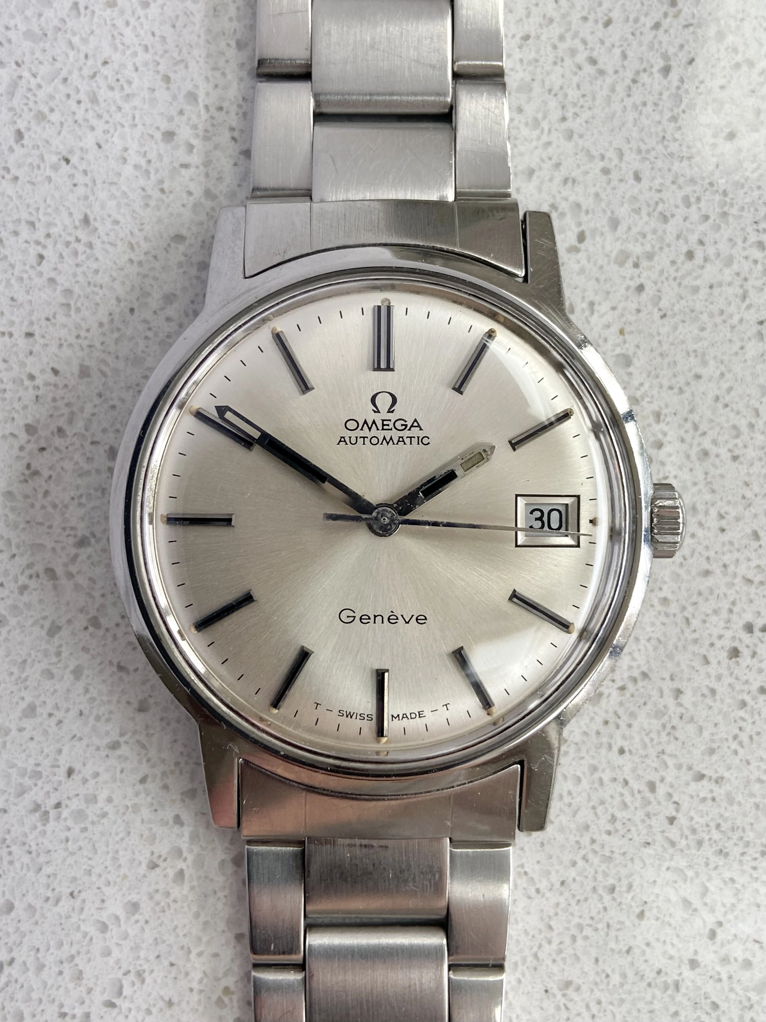 Offering for sale a vintage Omega Geneve reference 166.070 with lovely original dial in very good condition, a nice sharp case and solid 565 movement which is running well.