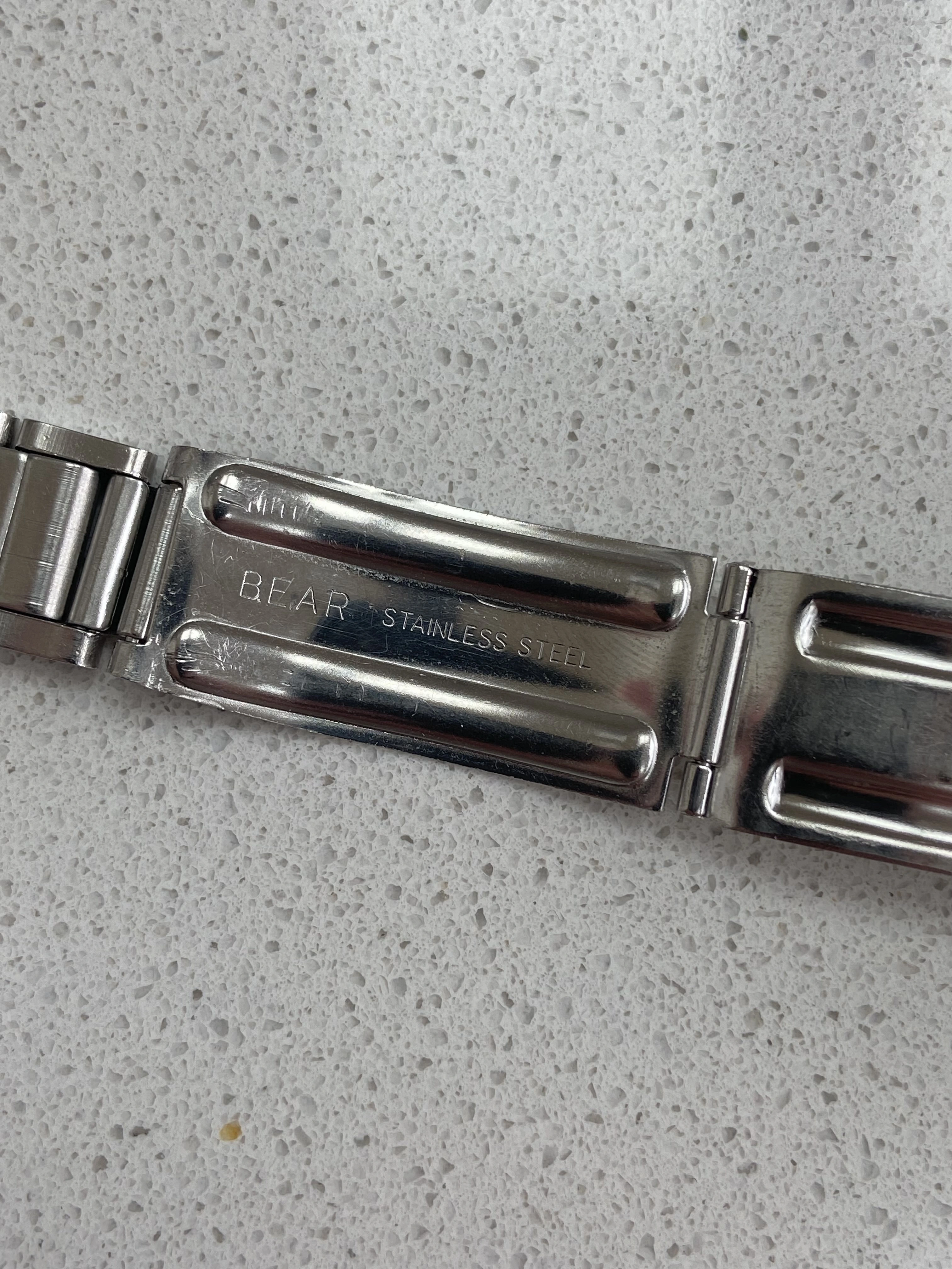 With original 1168 omega bracelet suitable for up to 7.5” wrist. The inner part of the clasp must have broken at some point in the watches history as it has been replaced with a generic piece.