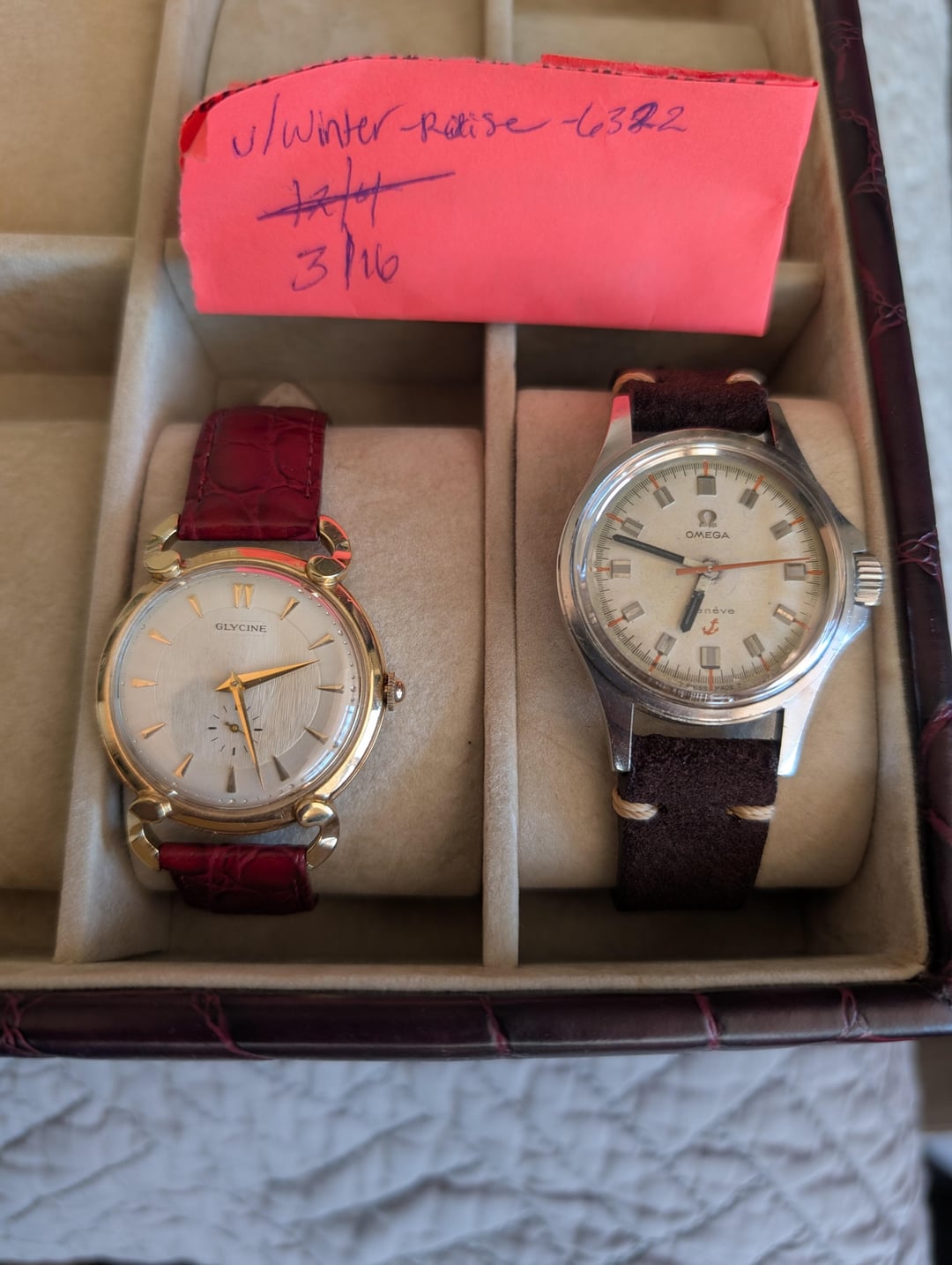 Hello everyone! Doing a little purge of pieces that do not get wrist time anymore. I have these 2 watches for sale that are ready to go. Omega Admiralty (mechanical)- serviced last year, worn only a handful of times, the watch has seen some love throughout the years before coming into my collection however nothing major other than the scratches on the case back and in between the lugs. Was asking $900 now kindly asking $800 OBO Glycine Robert (mechanical)- an elusive piece from Glycine from the 50s, worn for 2 years, thin profile and unique bull horn styled lugs in 14k gold. Was asking $1150 now kindly asking $1000 OBO Free shipping on all pieces. Please DM if interested, I am happy to provide more pictures upon request. Thanks for looking :)