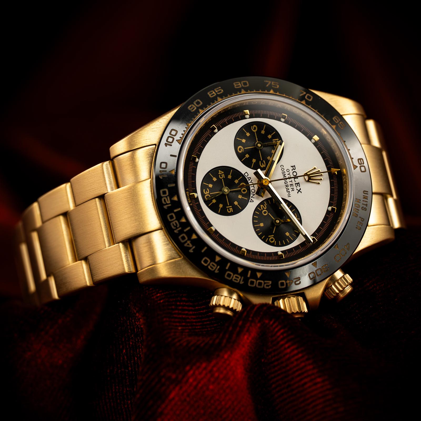 An icon reimagined; the Rolex Daytona “Paul Newman” was brought back to life by Titan Black in this stunning custom timepiece. Crafted from 18kt yellow gold with the signature white racing dial with black subdials, this legendary design is timeless. This watch presents in excellent condition, with little to no signs of wear. Please reference the photos for the most accurate representation of the condition of the watch. We do our best to emphasize, rather than diminish any flaws through our macro photography. This timepiece comes with its box from Titan Black. Price is **$53,995**, which includes **free overnight CONUS shipping**. Forms of payment accepted: **Bank wire, Crypto (+2%), Credit Card (+3.5%), Affirm (+6.5%)** We ship **fully insured overnight via FedEx or UPS**. We’re also open to meeting in person if you are in the Los Angeles area and are happy to hop on a call or FaceTime to show you the watch or answer any questions. Please do not hesitate to reach out. We stand behind our watches as being described and authentic. We’re very customer service focused and strive for 100% positive transactions each and every time. Thank you for your time! **Pictures:** https://imgur.com/a/1RRI7kv **Timestamp:** https://imgur.com/a/IcTn8As Find us on Instagram **@TheStellarisCollection** ------------------------------------- Brand: Rolex / Titan Black Model: Daytona Reference Number: 116528 Movement: Mechanical (Automatic) Movement Caliber: 4130 Number of Jewels: 44 Power Reserve: 72 Hours Case Size: 40mm Case Material: 18kt Yellow Gold Bezel Material: Black ceramic Dial: White with black subdials Original Box: Yes Original Papers: No Water Resistance: 100M (10ATM) Crystal: Sapphire Crystal Bracelet Material: 18kt Yellow Gold Clasp: Fold-over Clasp Material: 18kt Yellow Gold Functions: Small seconds Gender: Men’s Watch/Unisex ---------------------------