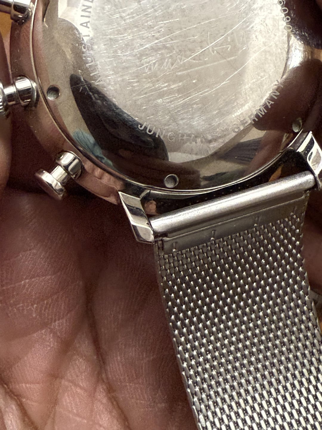 $1150 Feel free to reach out with any questions or requests for additional photos. Thanks for looking! Condition: Watch head: 90% (due to marks on lugs and caseback, shown in pictures) Strap: 100% unworn Comes with original box; no papers Beautiful watch Specifications: Reference Number: 027/4003.44 Case Material: Stainless steel Case Diameter: 40 mm Case Thickness: 14.4 mm Dial: Matte silver-plated with Arabic numerals Hands: Stick-shaped with environmentally friendly luminous substance Movement: Automatic Junghans caliber J880.2 (based on ETA/Valjoux 7750) Power Reserve: 48 hours Functions: Hours, minutes, small seconds, date, chronograph Crystal: Domed plexiglass with SICRALAN coating Case Back: Closed stainless steel Water Resistance: 30 meters (3 ATM) Strap: Milanaise bracelet with safety buckle Lug Width: 20 mm Feel free to reach out with any questions or requests for additional photos. Thanks for looking! For a detailed review of this watch, you might find this video helpful: I’ve sold many watches on Watchuseek (jimiwilli), Longtime member and seller at watchfeeks (Alkies) and Baby (cbarnes767). NO TRADES AT THIS TIME - Unless they include a watch I’d want and at least 60% of the listed price. This watch is being sold as is. Acceptable payments are Venmo, Zelle, PayPal F&F, or CashApp. While I make every reasonable attempt to tell you the condition and maintenance history of the watch, I am not a watchmaker. I am not affiliated with any of the brands, and only sell and buy as a personal collector and lover of watches. I am consolidating a very large collection as I’m putting the last kid in college and we are downsizing our home and lifestyle. References https://www.watchuseek.com/threads/jimiwilli-is-a-reliable-seller.5457277/?post_id=55955740#post-55955740 https://www.watchuseek.com/threads/jimiwilli-great-seller.5459605/?post_id=56000288#post-56000288 https://www.watchuseek.com/threads/jimiwilli-is-an-awesome-seller.5496206/?post_id=56656643#post-56656643 https://www.watchuseek.com/threads/jimiwilli-is-an-awesome-seller.5461688/?post_id=56038769#post-56038769 https://www.watchuseek.com/threads/jimiwilli-is-a-great-guy.5240330/?post_id=52438327#post-52438327 https://www.watchuseek.com/threads/jimiwilli-is-a-great-guy.5240330/?post_id=52438327#post-52438327