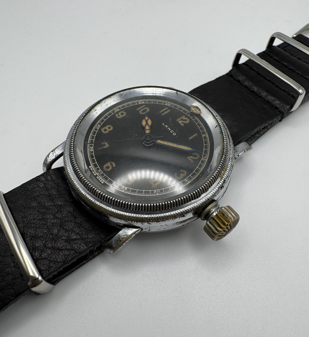 This antique Lanco military pilot watch remains in completely original and unrestored condition, preserving its historical integrity. The nickel-plated case exhibits wear consistent with its military use, a testament to its role in the field. The black glossy dial has aged remarkably well, retaining its original radium lume, which still glows briefly under UV light. The blued steel hands, also featuring the original lume, match the dial perfectly. With an impressive 41mm x 45mm case, this watch offers a substantial presence on the wrist. The movement was serviced by the previous owner and continues to keep accurate time. Paired with a new vintage-style 22mm black leather NATO strap, this rare military timepiece is a significant addition for collectors of wartime aviation history. **Size:** 41mm 🏞️ [Album](https://imgur.com/a/XzN8GE3) ☑️ [Timestamp](https://imgur.com/a/qCLPIKa) 📜 Includes: No box or papers 💵 Price: $1,495 + FREE overnight shipping with FedEx fully insured. 🔥 Followers on [Instagram](https://www.instagram.com/bogossiajewelers) get up to $1,000 off based on items price 🔥 📍 Location: New York 🔒 Authenticity: 100% guaranteed, buy with confidence. We have 110+ reviews on Chrono24 with 150+ transactions, and Excellent rating score on Trustpilot. Visit our [profile](https://www.reddit.com/u/BoghossianJewelry/s/vm81HAdB7o) for links and references. 📦 Domestic Shipping: Ships with FedEx overnight, within 24 business hours of payment, from New York, NY to CONUS. The shipment is fully insured against damage, loss or theft. 🌍 International Shipping: Incurs an additional $100. 💳 Payment: PayPal, Wire/Zelle (3% addtl discount), Web, or Face-to-face deal in NY. 🔐 [Seller References](https://bogossia.com/authenticity) 🔗 [Other Listings](https://www.reddit.com/u/BoghossianJewelry/s/vm81HAdB7o) 🌠 [Instagram](https://www.instagram.com/bogossiajewelers)