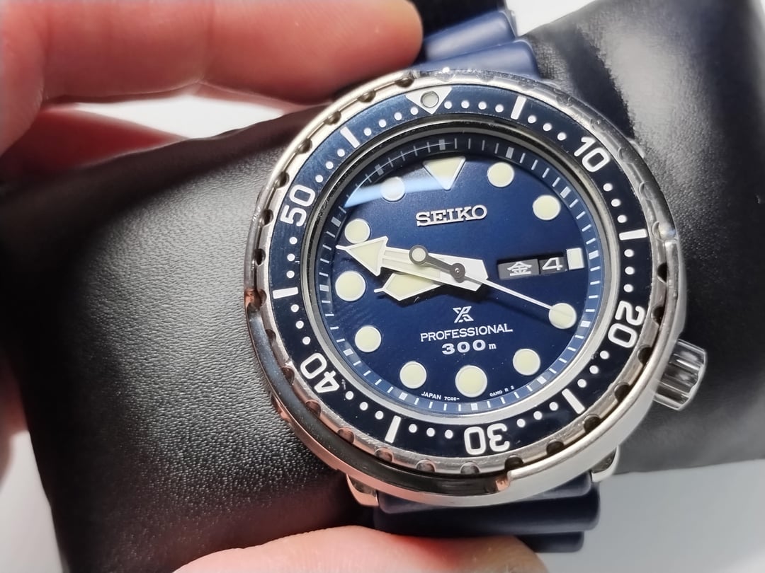 I decided to check out the new generation of Tunas. The design is not for me and it is time for it to move on. This one was definitely well loved. **Specs:** Movement Type: Quartz * Calibre Number: 7C46 * Collections / Series: Marine Master Tuna Can * Accuracy: ±15 seconds per month * Style: Diver * Case Material: Stainless Steel with Diamond shield Case coating * Case Colour: Silver * Band Material: Silicon * Strap Colour: Blue * Dial Type: Analog * Dial Colour: Blue * Glass Type: Dual curve Sapphire with anti-reflection coating * Water Resistance: 300 metres * Size: 46.6 mm × 47.7 mm × 14.1 mm * Weight: 129 g **Condition**: Watch head 8/10 the crystal has no scratches, the bezel has a few good ones, it also looks like it was banged about a bit. The shroud is slightly dented on the right side. No functions are affected. Bracelet- 7/10 overall in beat-up condition. Refer to photos in detail please. **Kit/working condition**\- This watch come with boxes inner and outer. It comes with the Seiko instruction manual and information booklet. Kit is complete. **Price:** $850 **Paypal FF or GS,** If GS buyer covers fees. Shipping included. Feel free to reach out with any questions. Only looking for very specific trades. The SBBN007 or the SBBN039 (Padi Tuna).