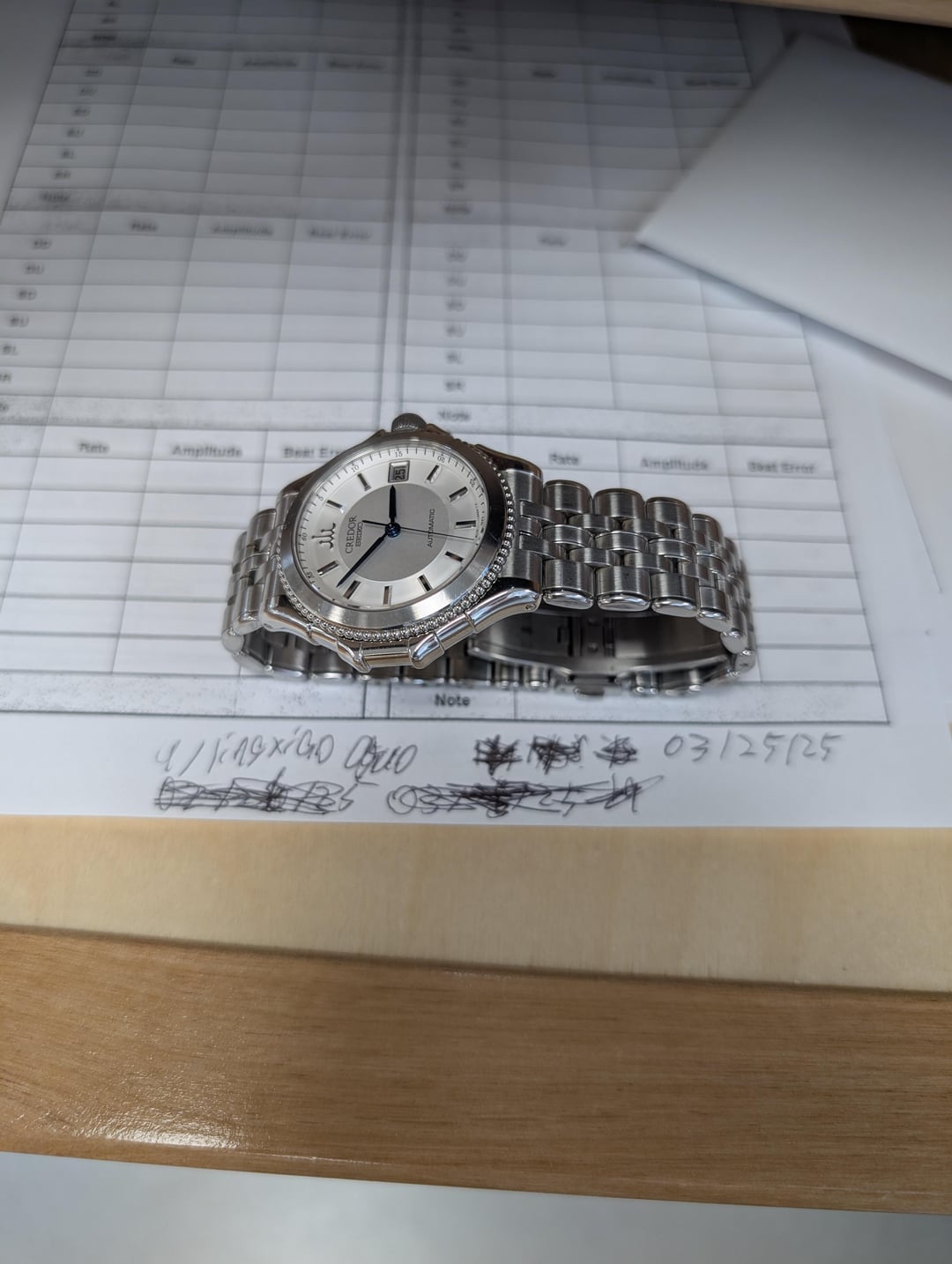For sale today is my Credor Pacifique GCBR991. This is one of the full sized Pacifiques equipped with the 8l75 movement (Grand Seiko 9s55). This piece is in good cosmetic condition consistent with its age. Please inspect the images carefully for an accurate representation of the condition. Mechanically the movement is running with acceptable readings. The amplitude, rate, and delta are all in acceptable condition. The original box, instructions, and care pamphlet are included. I'm asking ~~$1650~~ $1500 shipped CONUS for this piece. International shipping at buyer's expense. Thanks for reading!