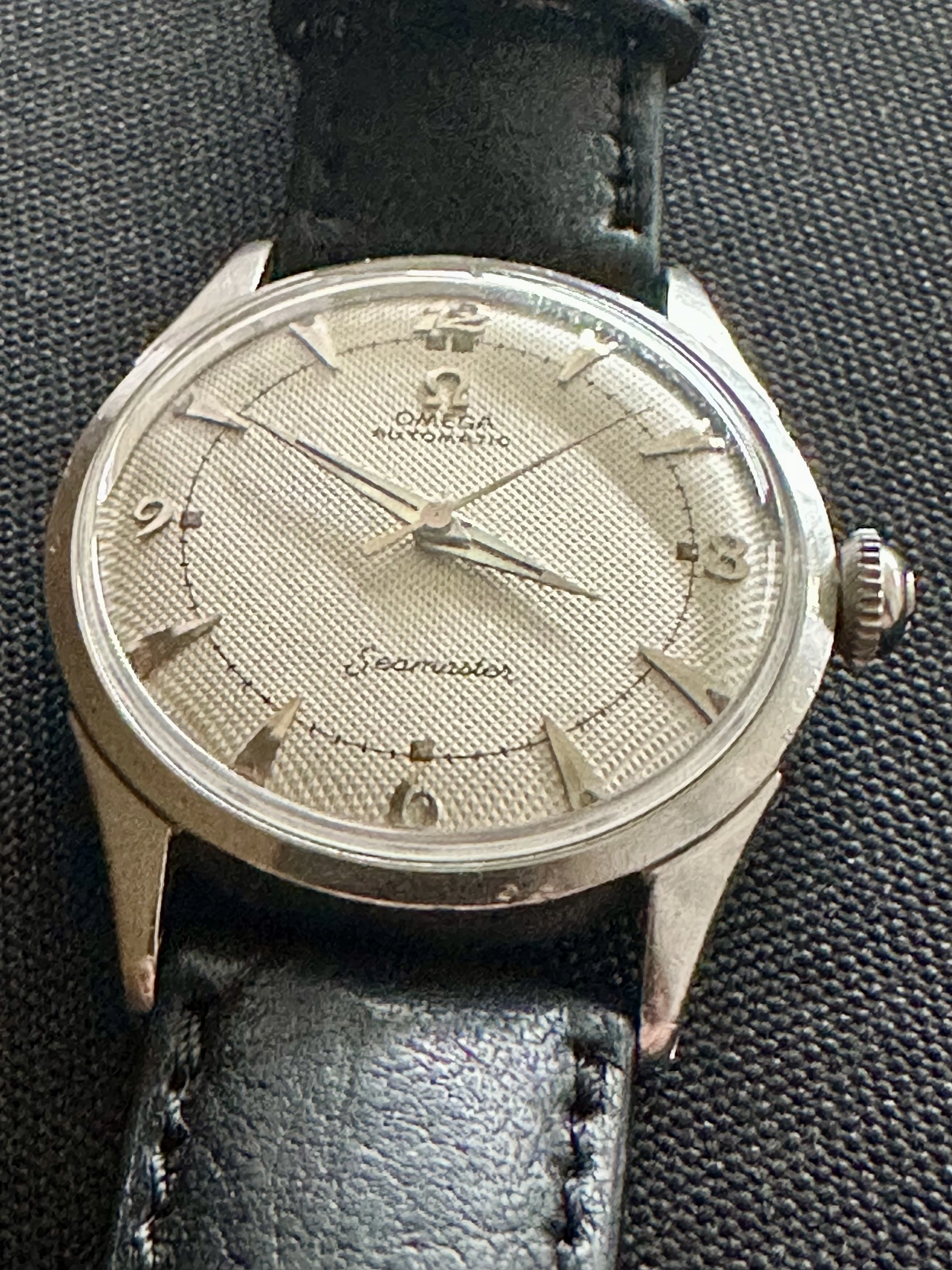 Good day all. Up for sale is something special - a 1952 Seamaster with a flawless honeycomb dial, perfect railroad track, silver Breguet numerals at 3, 6, 9 and 12, silver shark markers, Dauphine hands, and gorgeous radium lume. The case appears to be unpolished, with drilled lugs, and the correct Omega crown. You want more? Ok, how about this: the 1952 caliber 354 bumper was completely serviced from my watchmaker on 9/25/2023. All worn parts were replaced, the service paperwork will be included, and the watch is presently running at +6 SPD.