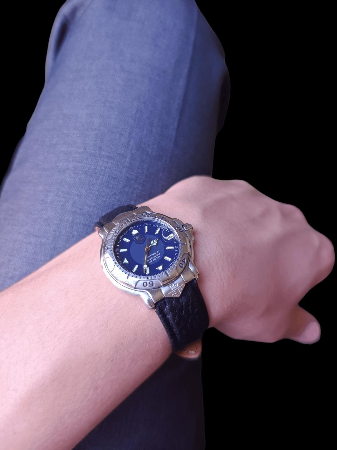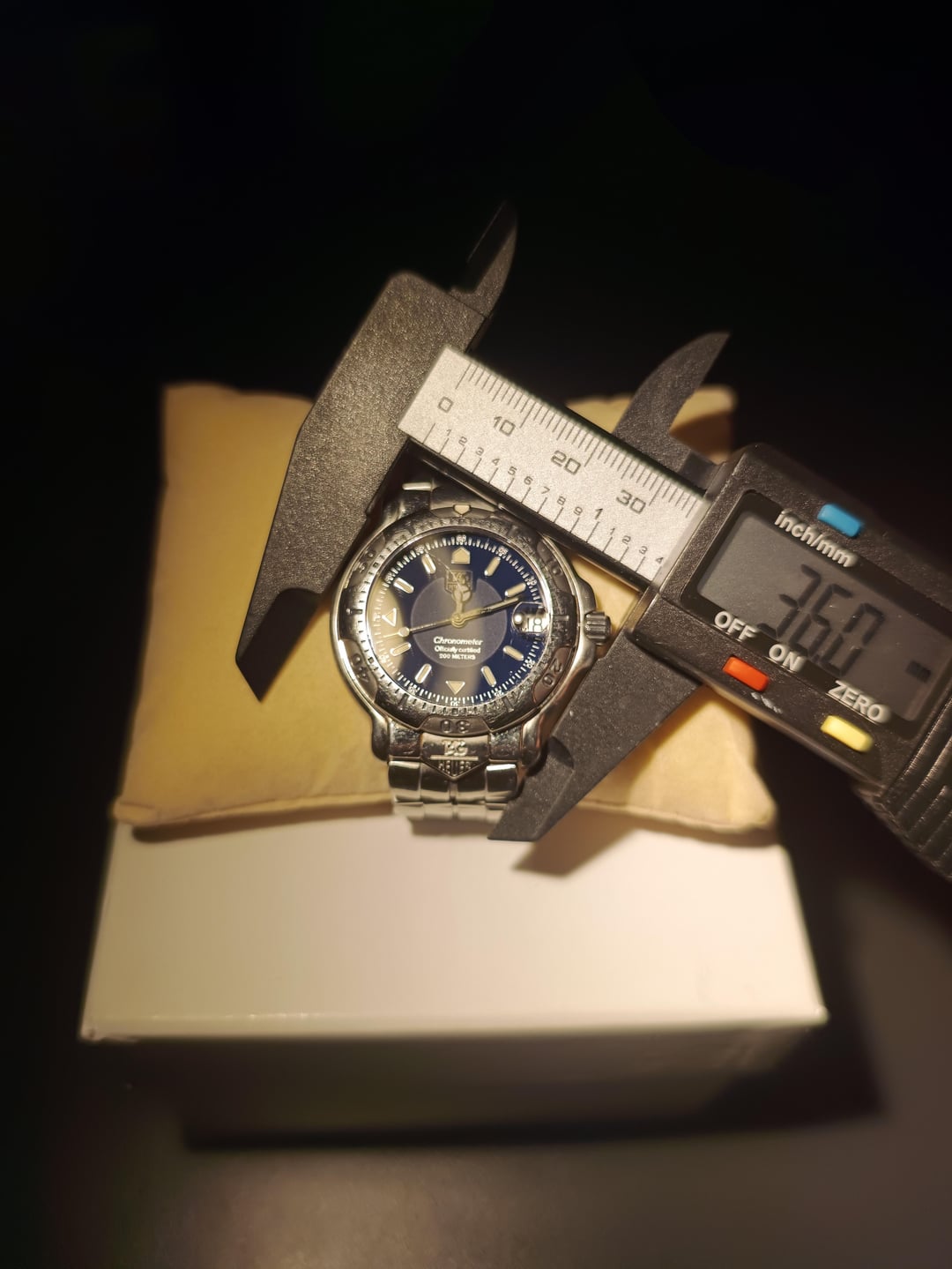 For sale @ https://www.ebay.com/itm/127062370637 Asking price: ~$350 Specifications: Movement: Automatic, COSC-certified chronometer Case: Stainless steel, 36mm (38mm including crown) Dial: Deep blue with date at 3 o’clock Bracelet: Original stainless steel bracelet, presently sized for a smaller wrist and would benefit from additional links for optimal fit. Supplied with an accompanying leather strap for versatility. Water Resistance: 200m Year: c.1994 A fine example of 1990s TAG Heuer craftsmanship — a collectible timepiece for the discerning enthusiast. Condition: Pre-owned; see photographs for precise details. In proper working order, currently keeping good time. Presents with a minor scratch to the top left corner of the glass, and a slight dent on the date magnifier. Still, in great shape overall, ready for the next chapter. Price reflects condition. Diver's best friend! Insured shipping: This vintage piece is carefully wrapped and shipped in a reinforced watch case clearly marked Fragile, to ensure safe and undamaged delivery. Please note: Watch case is generic. Thank you for looking 😁