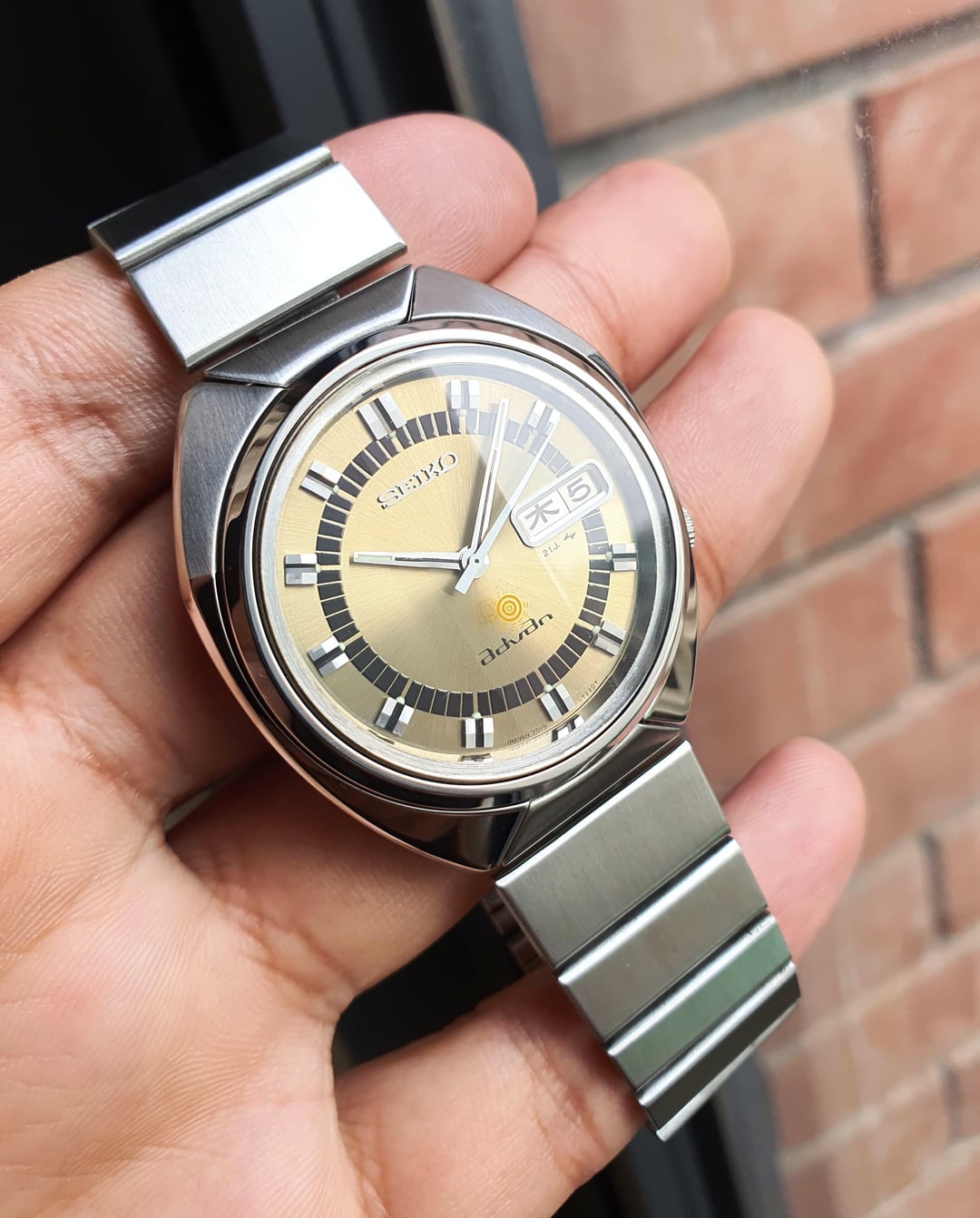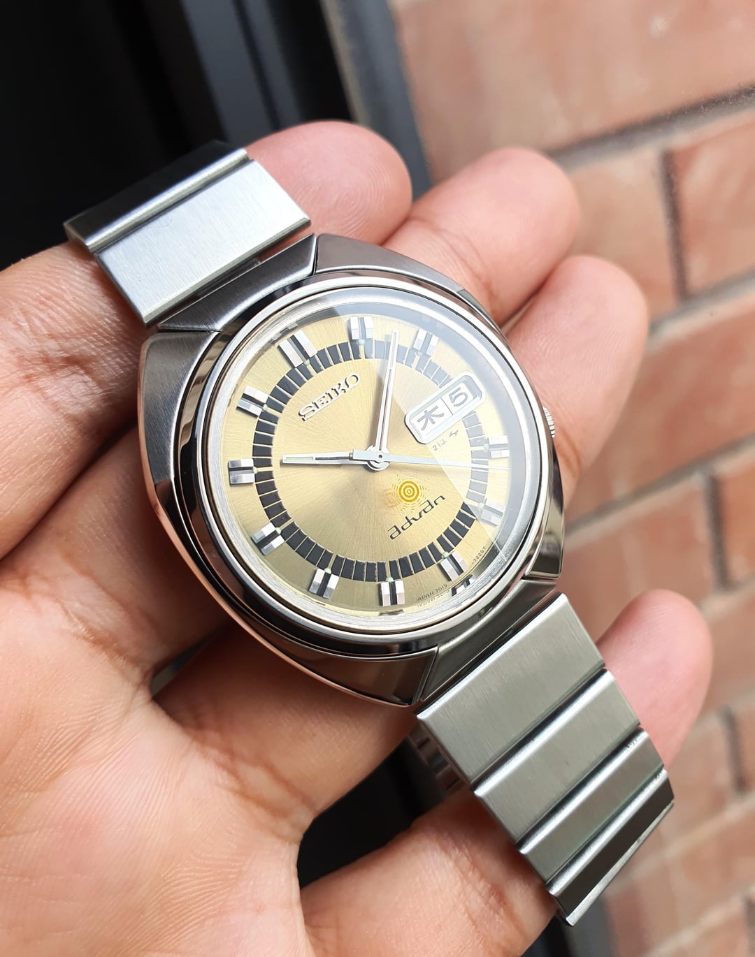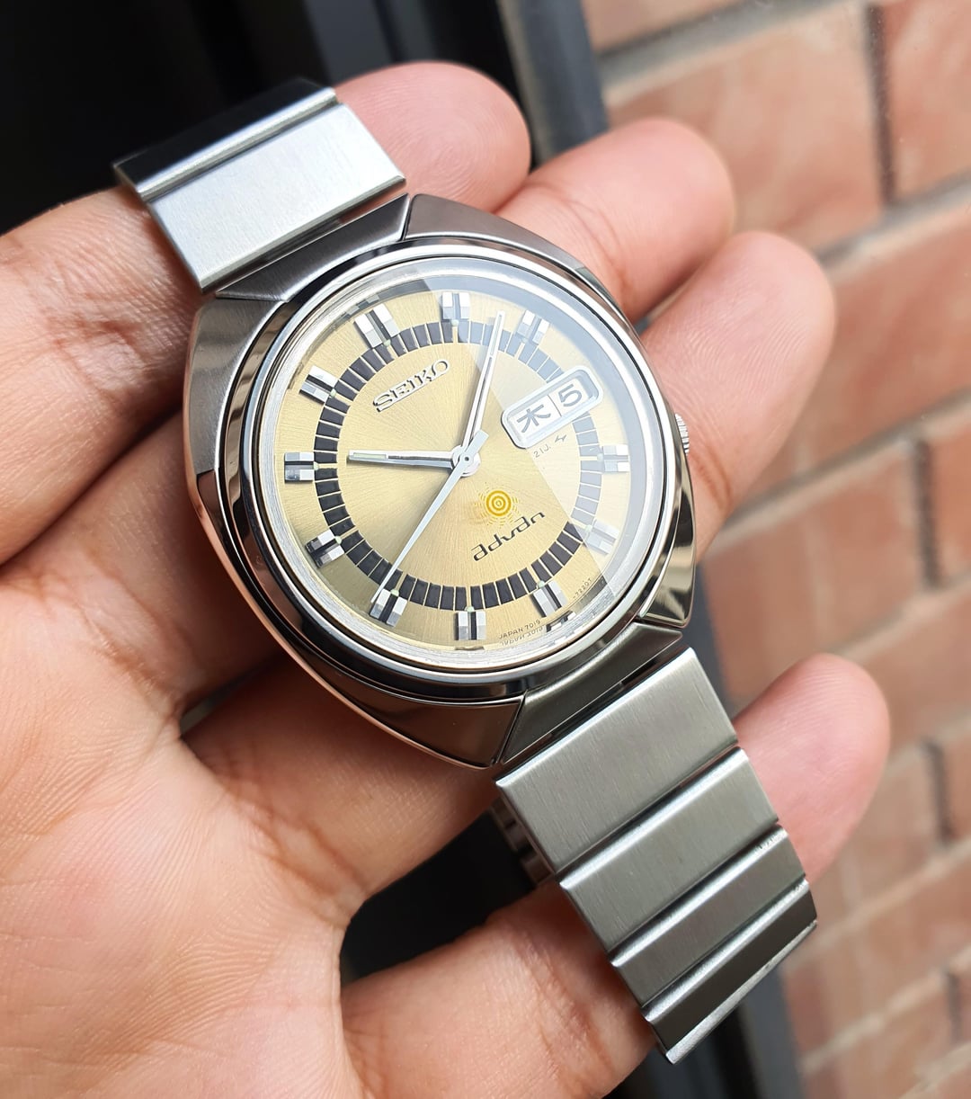 A very rare Seiko Advan watch in great condition. Futuristic design. Stunning Vibrant Peach brown sunburst dial, unique layout. Very thoughtful creative design all over. Raised Faceted indexes make the dial pop. Beefy solid Jumbo cushion case. Original Seiko Advan signed solid bracelet. Faceted unique Crystal gives it a retro vibe. Movement has been serviced. Good time keeping. Amazing condition at 53 year old, ready to be used as a daily driver. Such pieces should be appreciated upfront to experience at full measure, pictures don't do justice to this piece. Sunlight brings out most of its beauty. They were designed to have premium build quality but for only regions of Japan. Handling it, I can definitely guarantee this is superior to modern watches of the same price zone. Case is professionally polished keeping all the sharp brushed lines, edges and mirror finishing. It has both English and Japanese (Kanji) day options. The Kanji(Japanese) date and the Advan red logo highly complements the dial. A good Collectors piece. Crown perfectly blends into case. Such dials are highly sought after in Seiko world, so this is a great investment piece as well. Textured 3d Mirror finished hand complements the dial. They're only released in Japan, JDM model. The sun emblem on dial is exclusive to some Advan models. Advan was a premium seiko lineup. The date changing mechanism of the movement is rather special. By pressing the crown into the watch, the date will click and change automatically. PRICE: $279 USD via Paypal, Zelle, Venmo, TransferWise/Wise, Cashapp, Wire, Crypto. FREE Shipping worldwide. Considering a full service has been done to the watch, I'm asking a reasonable price. I have a good number of exchanges here for a safe transaction. Check my Instagram: [https://instagram.com/hour.lust](https://instagram.com/hour.lust) * Manufacturing Year: MAY 1972 * Caseback Reference: 7019-7280 * Case size: 37 mm * Lug to Lug size: 40.5 mm * Case thickness: 11.5 mm * 7019 Automatic Movement (21 Jewels) Pics: [https://imgur.com/a/1AjklRQ](https://imgur.com/a/1AjklRQ) TS: [https://imgur.com/a/cpHtJcu](https://imgur.com/a/cpHtJcu)