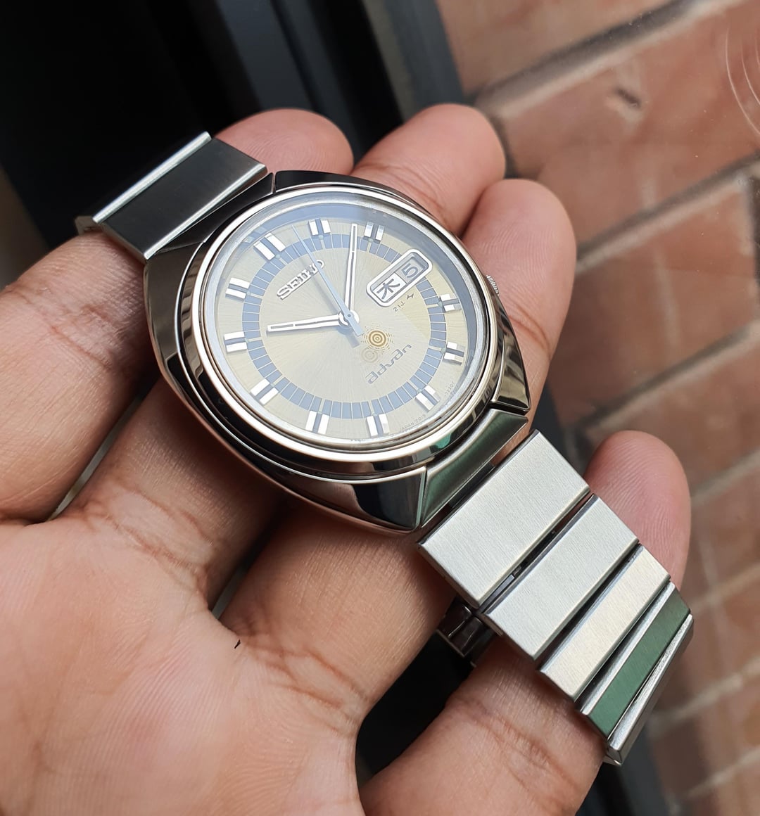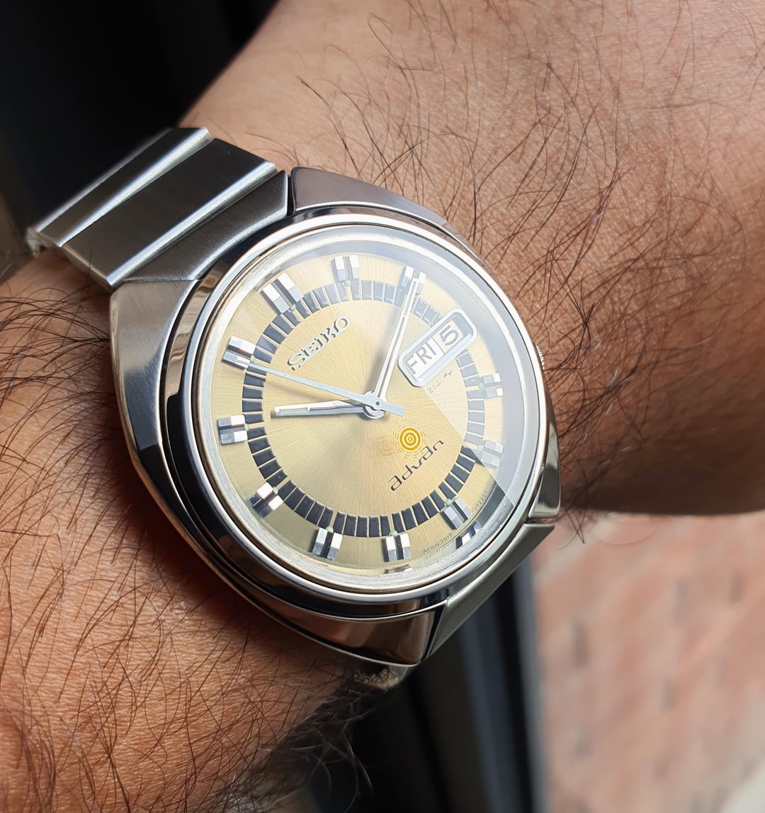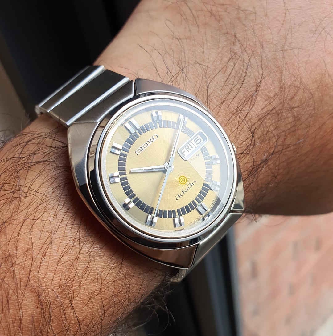A very rare Seiko Advan watch in great condition. Futuristic design. Stunning Vibrant Peach brown sunburst dial, unique layout. Very thoughtful creative design all over. Raised Faceted indexes make the dial pop. Beefy solid Jumbo cushion case. Original Seiko Advan signed solid bracelet. Faceted unique Crystal gives it a retro vibe. Movement has been serviced. Good time keeping. Amazing condition at 53 year old, ready to be used as a daily driver. Such pieces should be appreciated upfront to experience at full measure, pictures don't do justice to this piece. Sunlight brings out most of its beauty. They were designed to have premium build quality but for only regions of Japan. Handling it, I can definitely guarantee this is superior to modern watches of the same price zone. Case is professionally polished keeping all the sharp brushed lines, edges and mirror finishing. It has both English and Japanese (Kanji) day options. The Kanji(Japanese) date and the Advan red logo highly complements the dial. A good Collectors piece. Crown perfectly blends into case. Such dials are highly sought after in Seiko world, so this is a great investment piece as well. Textured 3d Mirror finished hand complements the dial. They're only released in Japan, JDM model. The sun emblem on dial is exclusive to some Advan models. Advan was a premium seiko lineup. The date changing mechanism of the movement is rather special. By pressing the crown into the watch, the date will click and change automatically. PRICE: $279 USD via Paypal, Zelle, Venmo, TransferWise/Wise, Cashapp, Wire, Crypto. FREE Shipping worldwide. Considering a full service has been done to the watch, I'm asking a reasonable price. I have a good number of exchanges here for a safe transaction. Check my Instagram: [https://instagram.com/hour.lust](https://instagram.com/hour.lust) * Manufacturing Year: MAY 1972 * Caseback Reference: 7019-7280 * Case size: 37 mm * Lug to Lug size: 40.5 mm * Case thickness: 11.5 mm * 7019 Automatic Movement (21 Jewels) Pics: [https://imgur.com/a/1AjklRQ](https://imgur.com/a/1AjklRQ) TS: [https://imgur.com/a/cpHtJcu](https://imgur.com/a/cpHtJcu)