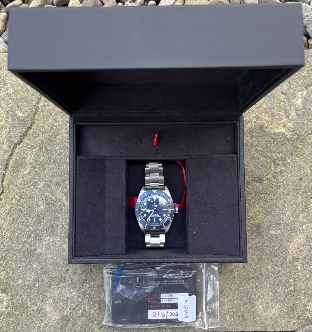 Hello r/Watchexchange! Up for sale is my stunning Tudor Black Bay Fifty-Eight in the highly sought-after blue colorway. I purchased this beauty brand new last year from an authorized dealer, and it's been meticulously cared for. The watch has been worn sparingly and shows only minimal wear—just some very faint scuffs on the clasp. Otherwise, it’s pristine and ready to be enjoyed by its new owner. **Condition:** Near-mint. The sapphire crystal, case, and bezel are immaculate and scratch-free. The only visible wear is a few extremely minor scuffs on the clasp from regular desk diving. **Specifications:** * Model: Tudor Black Bay Fifty-Eight (Blue) * Reference: 79030B * Diameter: 39mm (Perfect size for everyday wear) * Dial: Deep, rich navy blue dial with luminous hands and indices * Bezel: Beautifully matching blue aluminum rotating diver bezel * Movement: Tudor Caliber MT5402 (In-house, COSC-certified, 70-hour power reserve) * Water Resistance: Robust 200m rating, suitable for diving or daily adventures * Bracelet: Original Tudor stainless steel bracelet, complete with all extra links included **Price:** $2,500 (PayPal F&F preferred, please add 3% for G&S. Includes UPS shipping to CONUS) **Package Includes:** * Original Tudor box (inner and outer) * All original papers (warranty card, manual, booklet) * Extra bracelet links for a perfect fit **Seller References:** Although new to Reddit, I have a perfect seller rating and extensive history on eBay under username ddegroot23, where I’ve successfully sold numerous watches. Feel free to reach out with any questions or requests for additional pictures. Don’t miss your chance to own this modern classic at a great price! Thanks for looking!