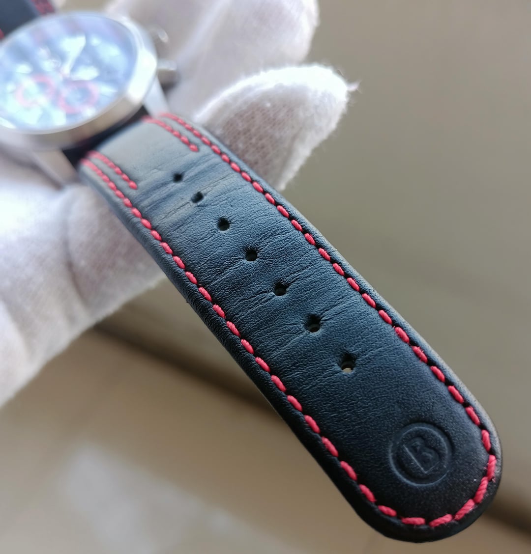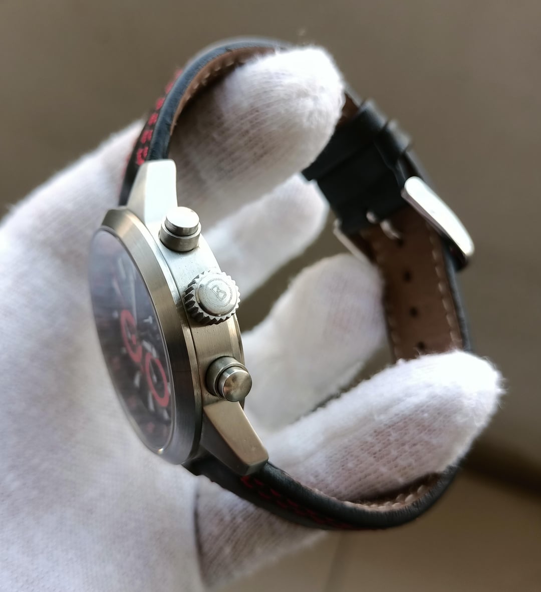 Bogner Risto Chronograph Watch. Ref-2.1021.745. Description and Features: Overall this is in good Working condition. Display of hours and minutes, small second at 3 o'clock. Screw-on crown with manufacturer logo. Black dial, with applied luminous indexes, luminous hands, 60-minute scale under the glass adjustable via crown at 10 o'clock. Glass Sapphire crystal. All Stainless Steel. Black leather strap with red decorative stitching. SPECIFICATIONS: Movement: Quartz, Case Diameter, 41 mm, Thickness 11 mm, Lug Width 20 mm, Lug to Lug 46 mm, Watch only. Please comment before messaging. Batteries are not allowed to be sent with the watches as per shipping policy. Payment Method: PayPal friends & family, Crypto, Payoneer & Binance Only. Shipping From FedEx Express Shipping. Price $105 Shipped. After payment confirmation the scheduled shipping time will be 2-3 working days.