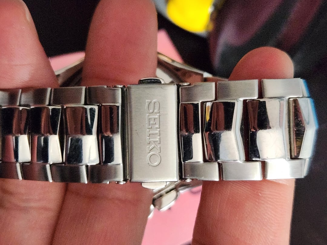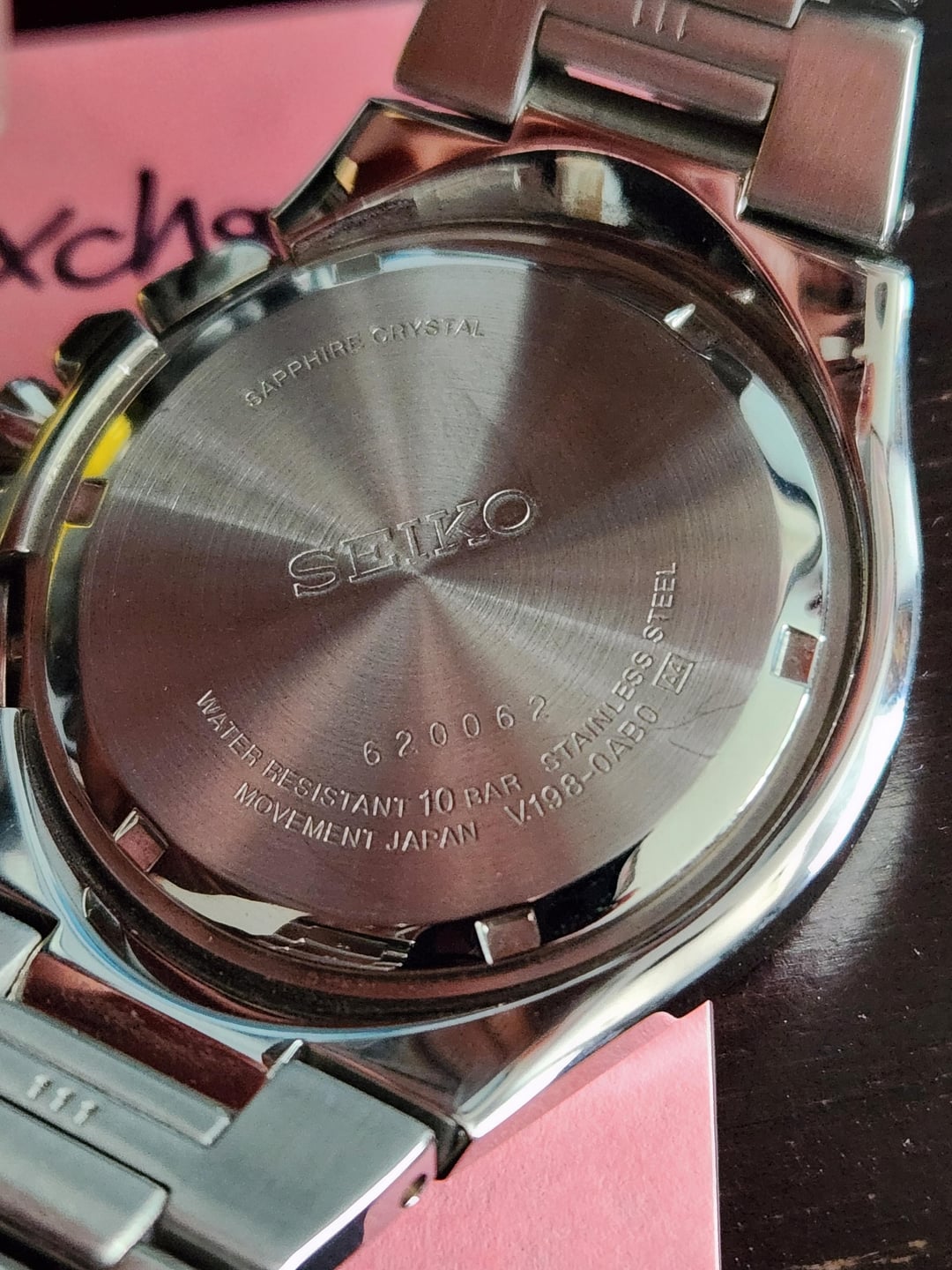 Hello. For sale. I'm the original owner. Comes with original box, 6 extra links (currently sized for 6.5"), hangtag. Watch is in good condition, crystal is clean. Some light marks on the bracelet, very faint mark on the bezel. It was in a box for a long time so it'll need a full charge. PayPal or Venmo. Asking $125 shipped in the US with USPS priority shipping. Specs below from Seiko. Thank you. V198 solar movement, 44mm by 12mm, sapphire crystal, alarm, perpetual calendar with leap year, chronograph, 100m wr, integrated bracelet.