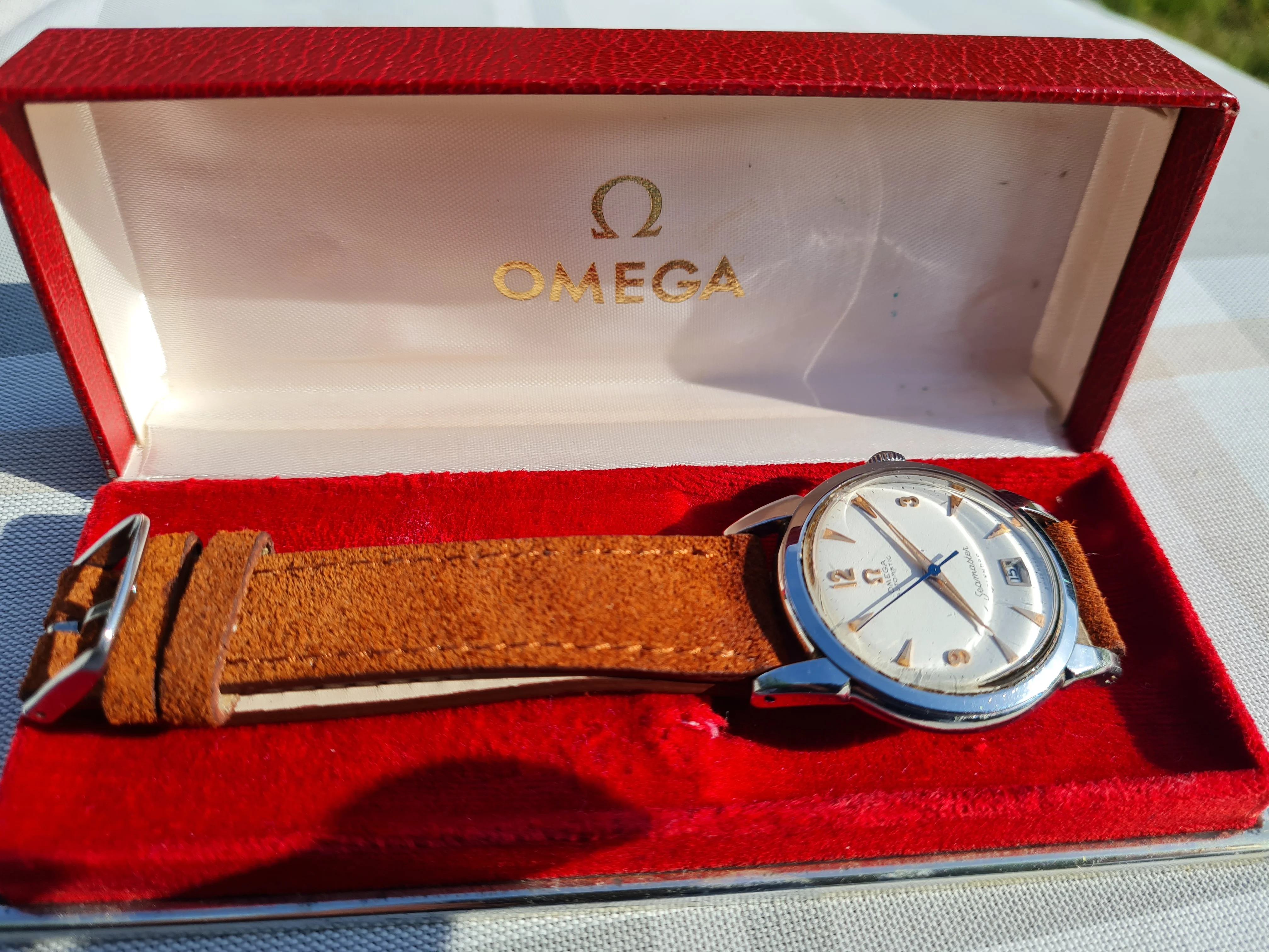 The watch comes with like new leather bracelet and Omega box (from 60s?).