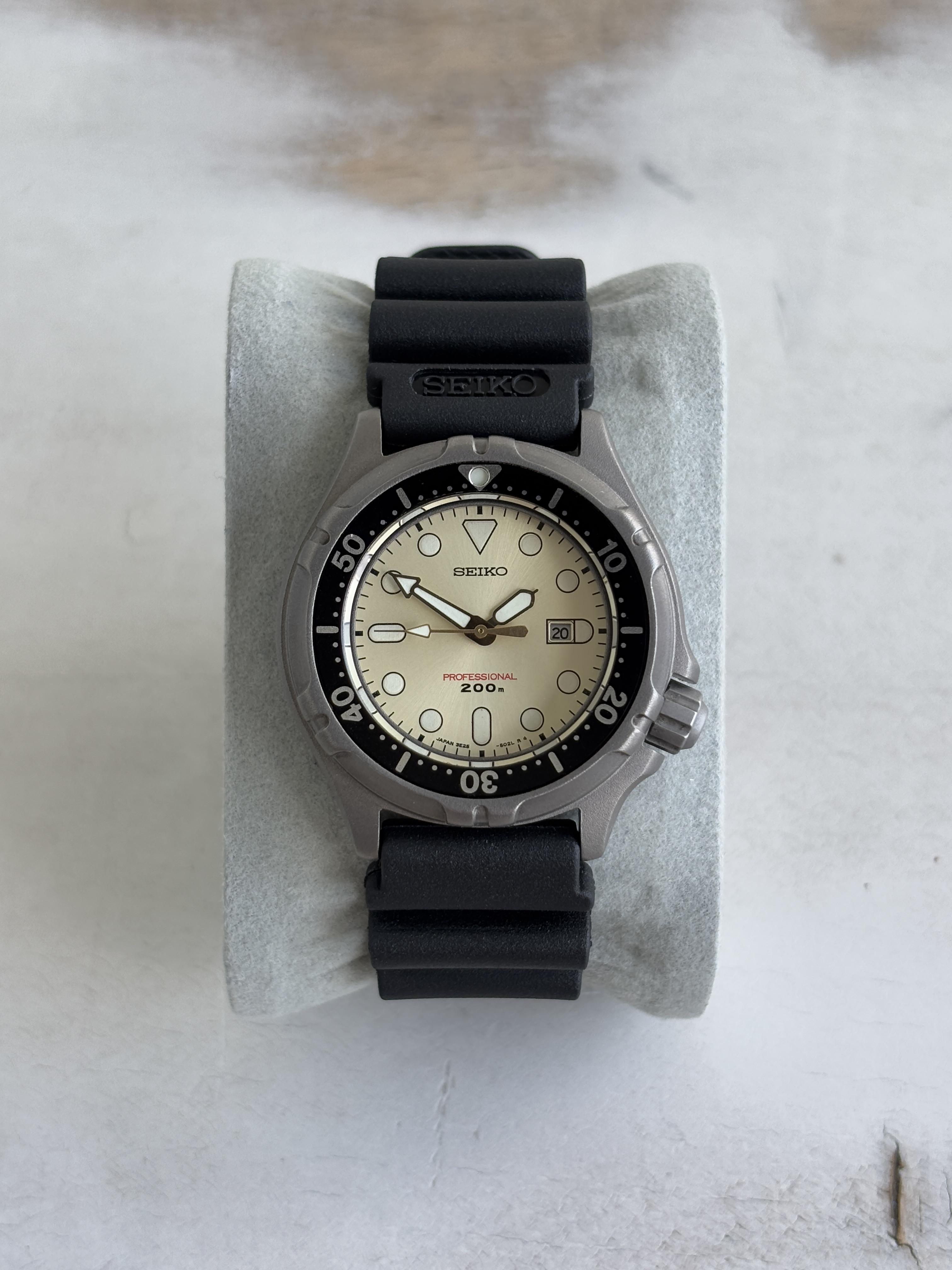 Seiko 3E25-2030 titanium. Produced in May 1990. Quartz movement. Watch is running good. Everything works as it should. Screw down crown. Bezel turns with clicks. Original Seiko new rubber strap. New battery. Case size: 34,5mm Thickness: 11mm Lug to lug: 39mm Lug width: 17mm Asking 290 USD shipped. No trades, please. Payment via Wise or PayPal F&F. Album: https://imgur.com/a/VjxQdUg Timestamp: https://imgur.com/a/EZXrxOD Thanks for looking and have a nice day.