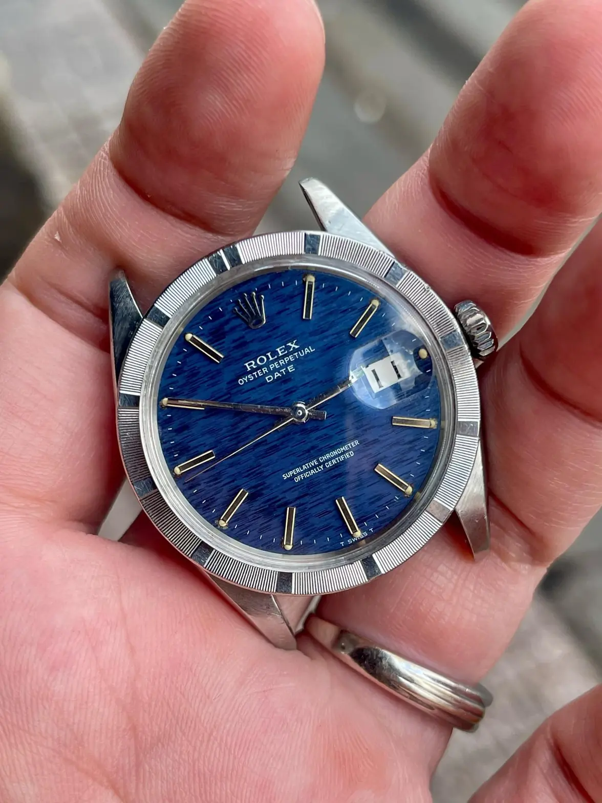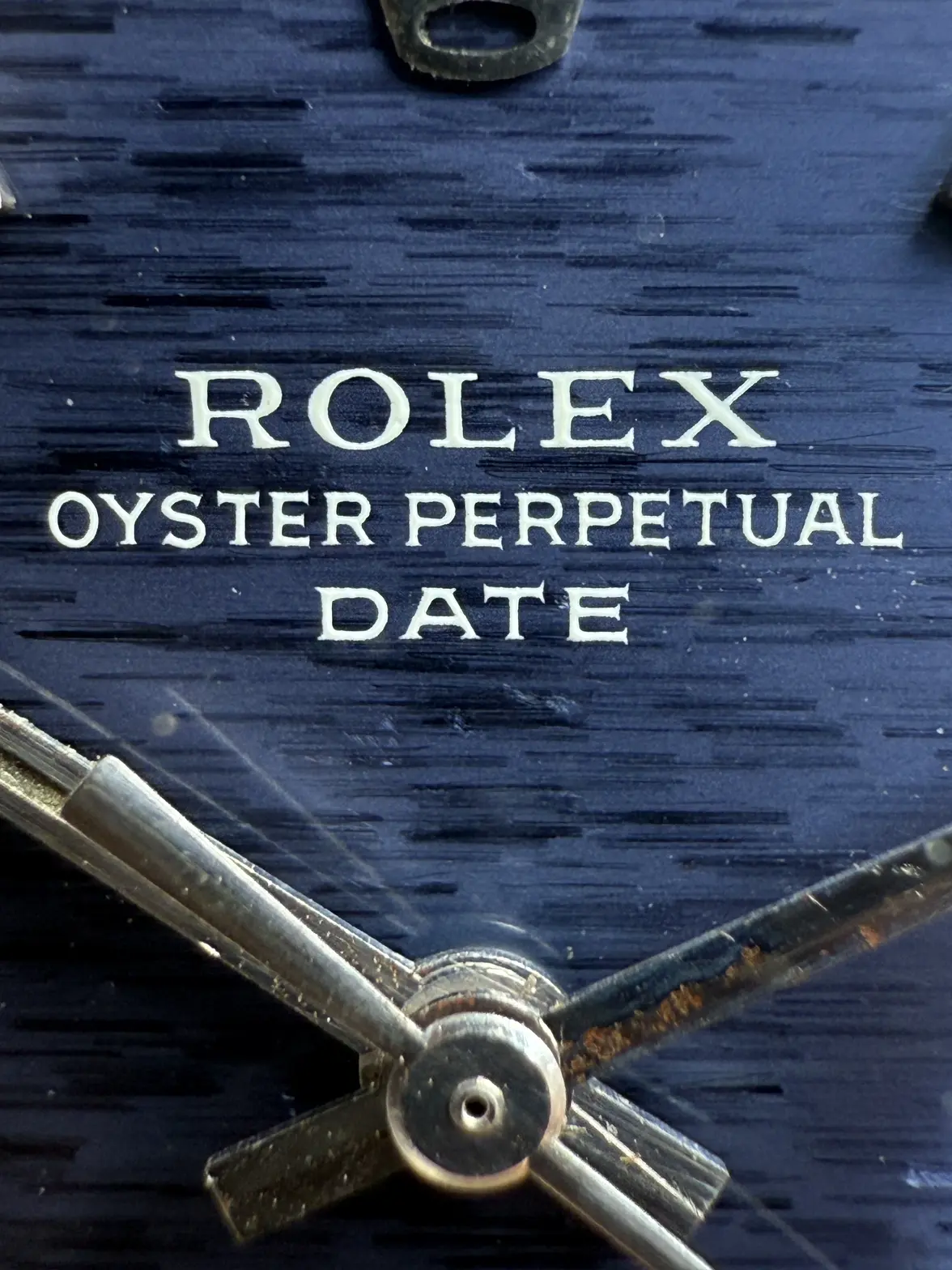 - Dial: Original blue mosaic/shantung/brick dial in very good condition, solid hour markers with lume, baton hands; date at 3; prints, hands, hour markers are all good.