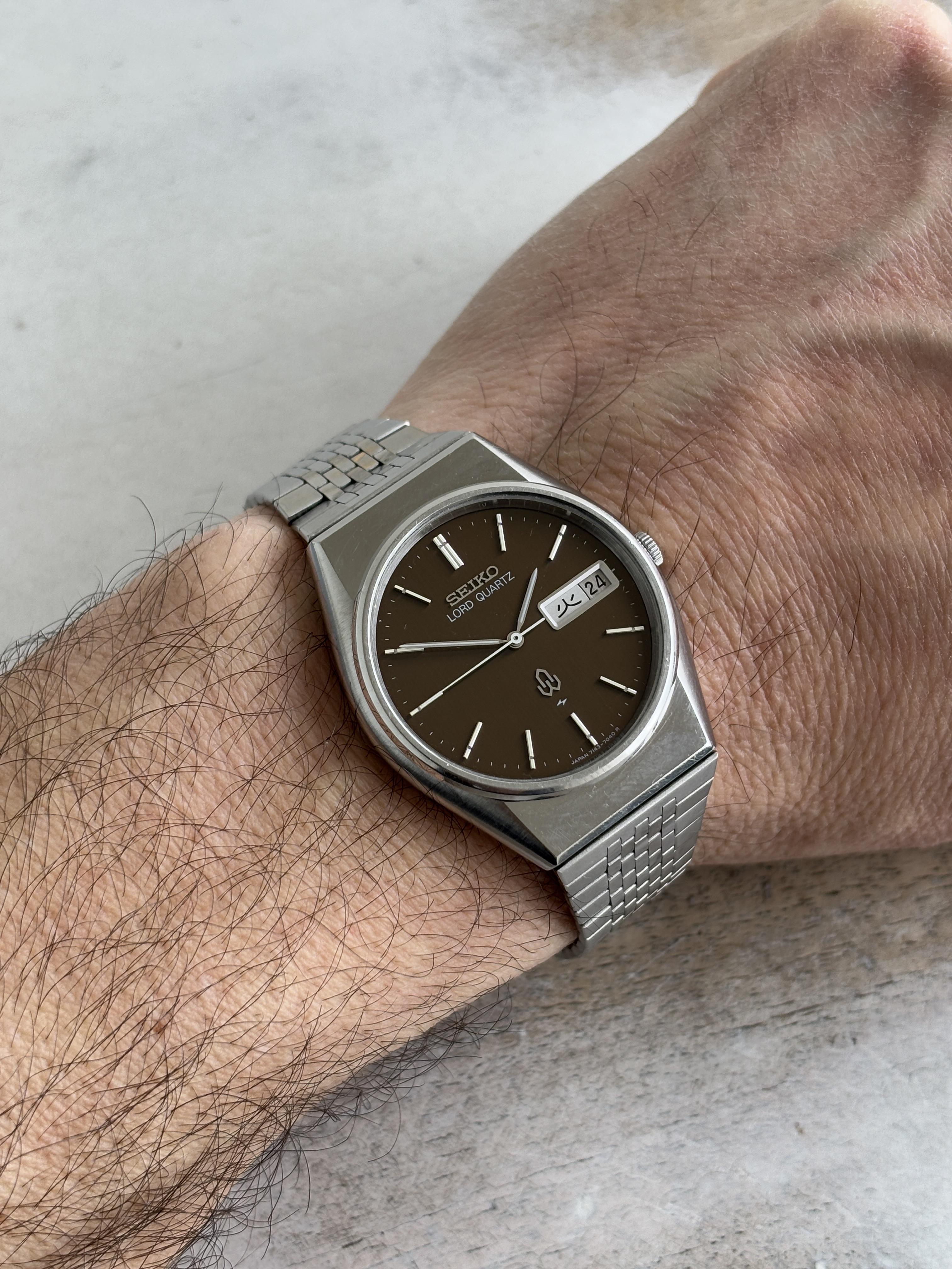 Seiko Lord quartz 7143-7030 with a very rare copper dial. Kanji/English day wheel. Produced in June 1979. Quartz movement. Watch is running good. Everything works as it should. New crystal installed. New battery. Case size: 34mm Thickness: 7,5mm Lug to lug: 39mm Lug width: 18mm Asking 260 USD shipped. No trades, please. Payment via Wise or PayPal F&F. Album: https://imgur.com/a/gYld7R2 Timestamp: https://imgur.com/a/EfqGVxj Thanks for looking and have a nice day.