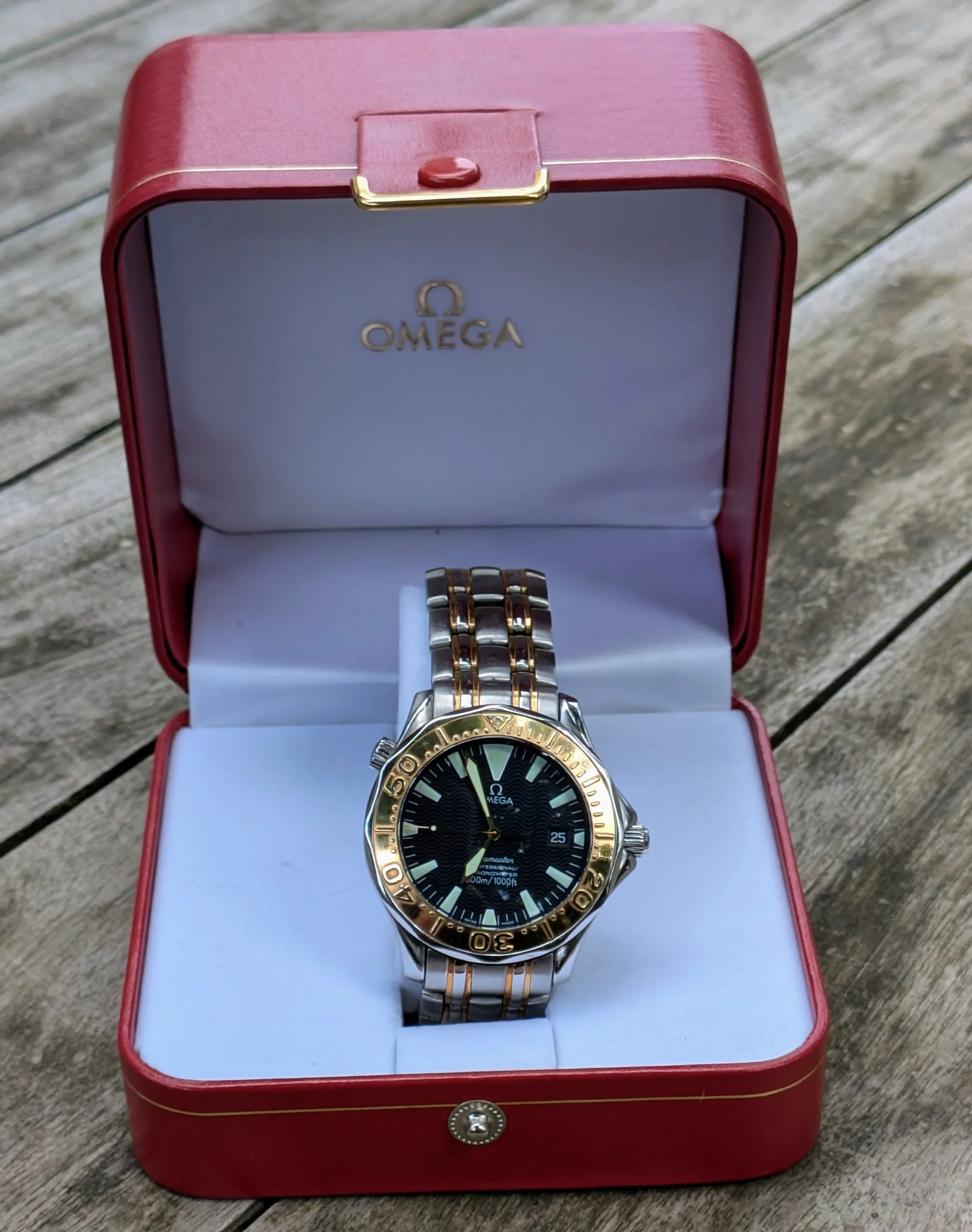 I let go from the collection a Steel/Gold Seamaster diver. It is the large (41mm) Automatic Version which is not that often on the market. It comes with it's S/G bracelet and original Box (No papers).