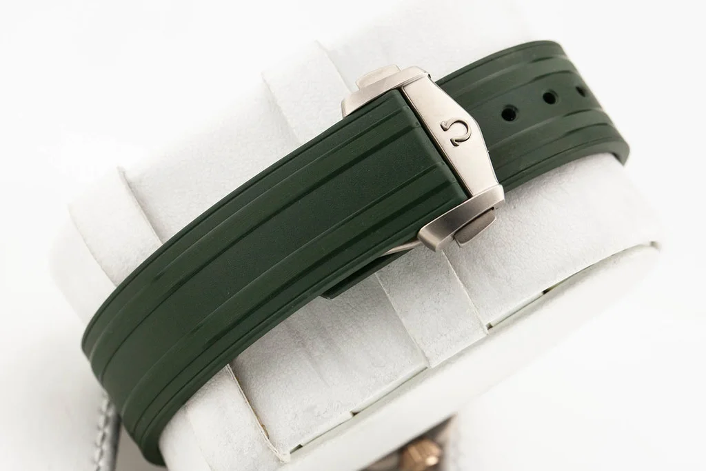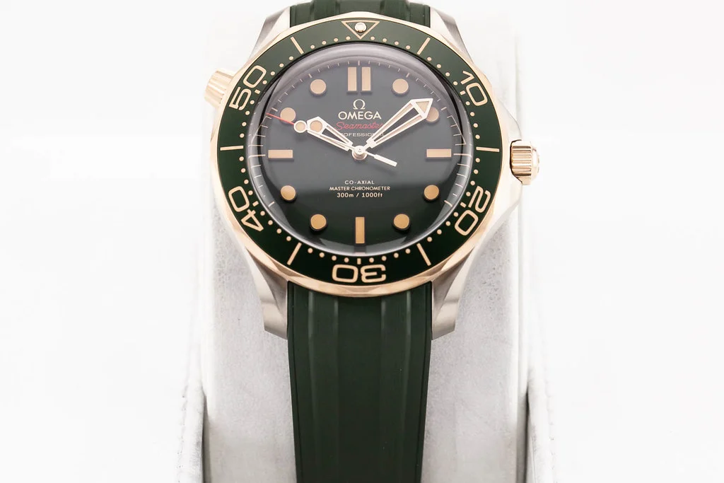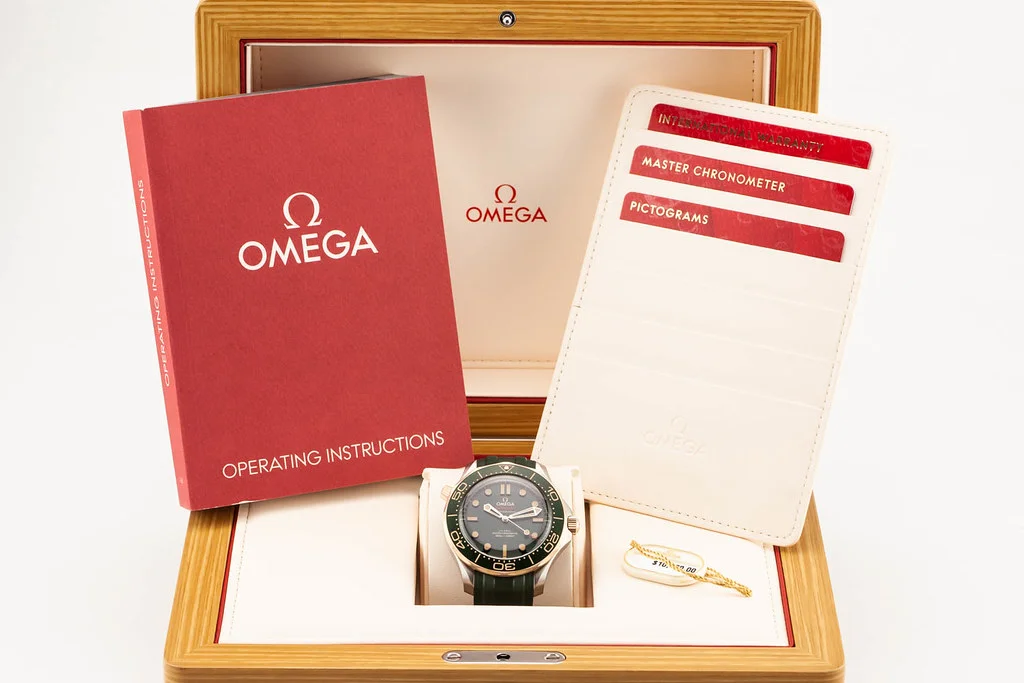 Up for sale is a brand new Omega Seamaster 300M 42mm Titanium / Bronze Gold Bezel Green Dial on Rubber Strap, reference # 210.92.42.20.10.001. It comes complete with all boxes, papers, booklets, hang tag and Omega Warranty Card dated May 2025.