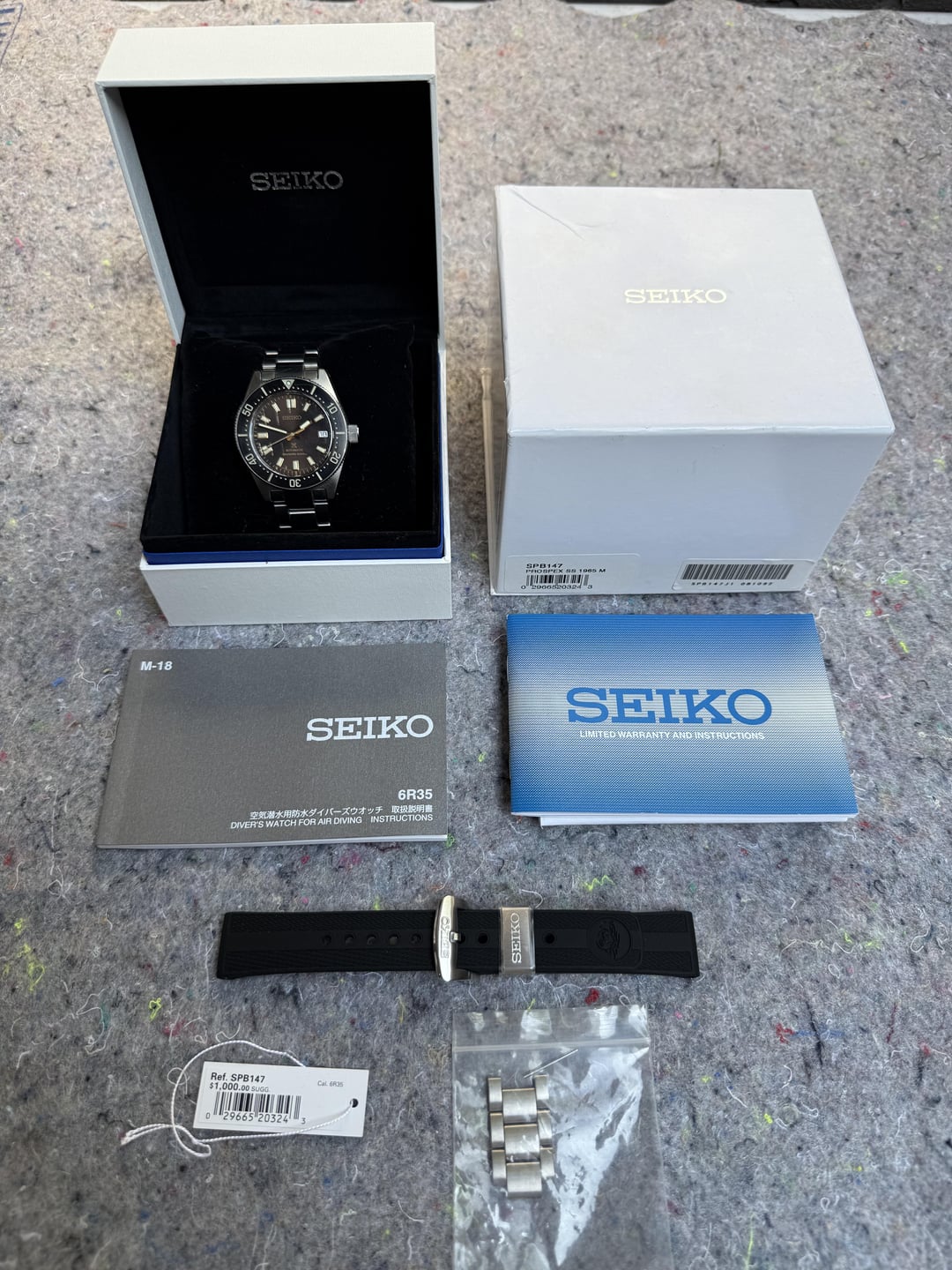 SEIKO SPB147 J1 Comes with box,papers, original rubber strap, and extra link. Watch keeps time well and functions perfectly. Bezel action is great and lume is very bright. There is one scratch on bezel insert at the 12:00 position, one surface scratch on top end link, and a scuff on the clasp. Aside from those issues there is normal wear on the bracelet. $600 plus shipping via PayPal.