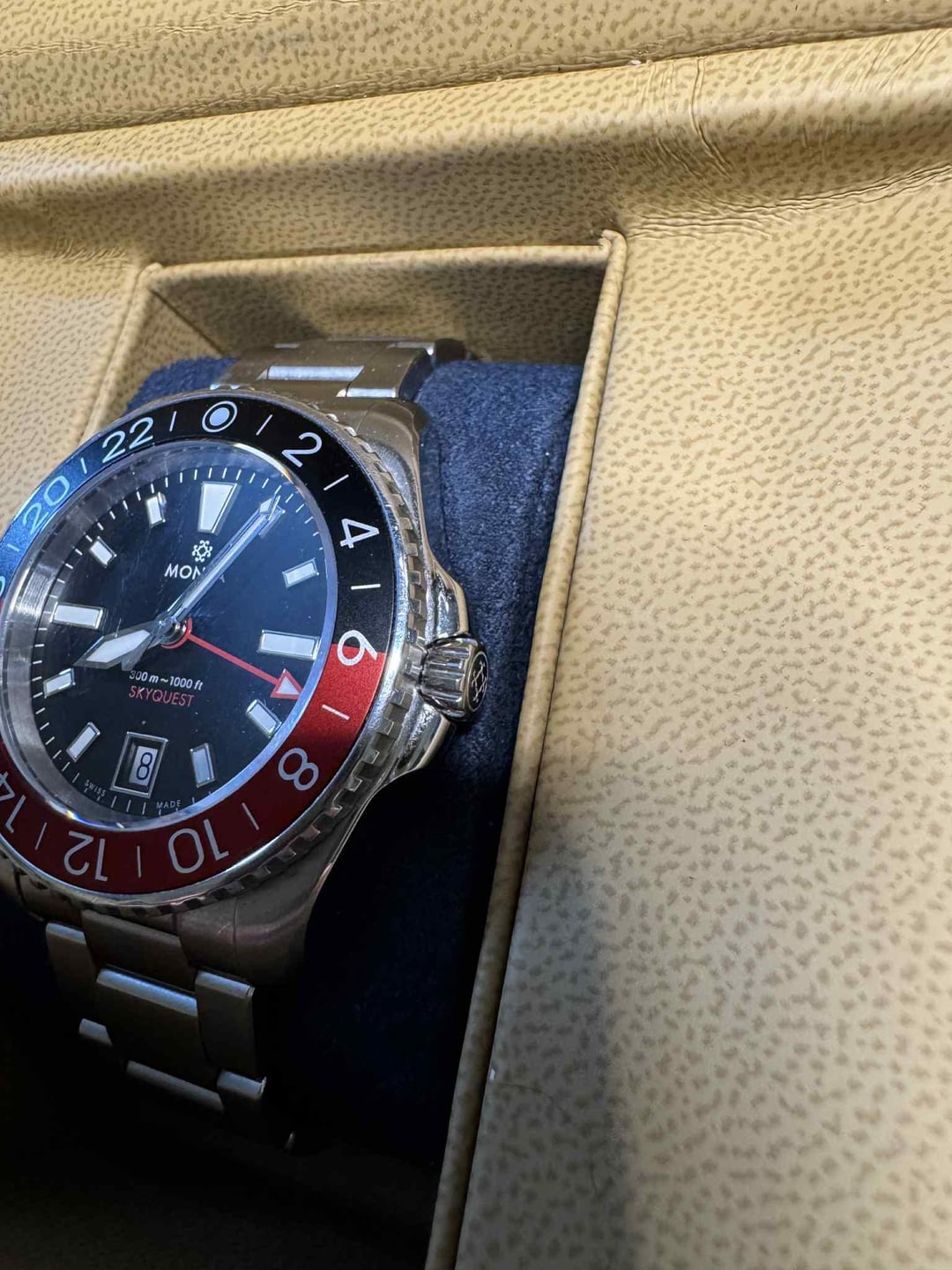 Hi Watchex, Listing one of my favorite watches which i had the pleasure of owning multiple times hence the sales on here. Monta Skyquest GMT is absolutely loved, kept in fairly good shape. The card is dated 2022. Runs like it should keeping great time. It is an excellent watch with amazing specifications and the fit and finishing is unmatched. The on the fly micro adust clasp is also extremely easy to use and makes Watch a lot more comfortable to wear. I believe the clasp is a V2 and has about 3 different adjustment modes. Price: $1450 OBO Condition: No bezel or crystal scratches, no dings or dents, clasp has some swirls and a few links have blemishes, very minimal case Blemishes as well from daily use. The watch keeps time as it should. Runs smooth 📍Plano, TX Payment: venmo, zelle, paypal Please feel free to reach out anytime if you have any other questions. Specs: Size 40.7mm Bezel: Anodized Red And Black Aluminum Crystal: Sapphire Movement: Calibre m-23 PR: 56 Hrs Please feel free to reach out to me if you have any questions or concerns about the Watch . All watches I sell are explained here based on my own observation. They’re all sold as is with. No Personal guarantee from me.