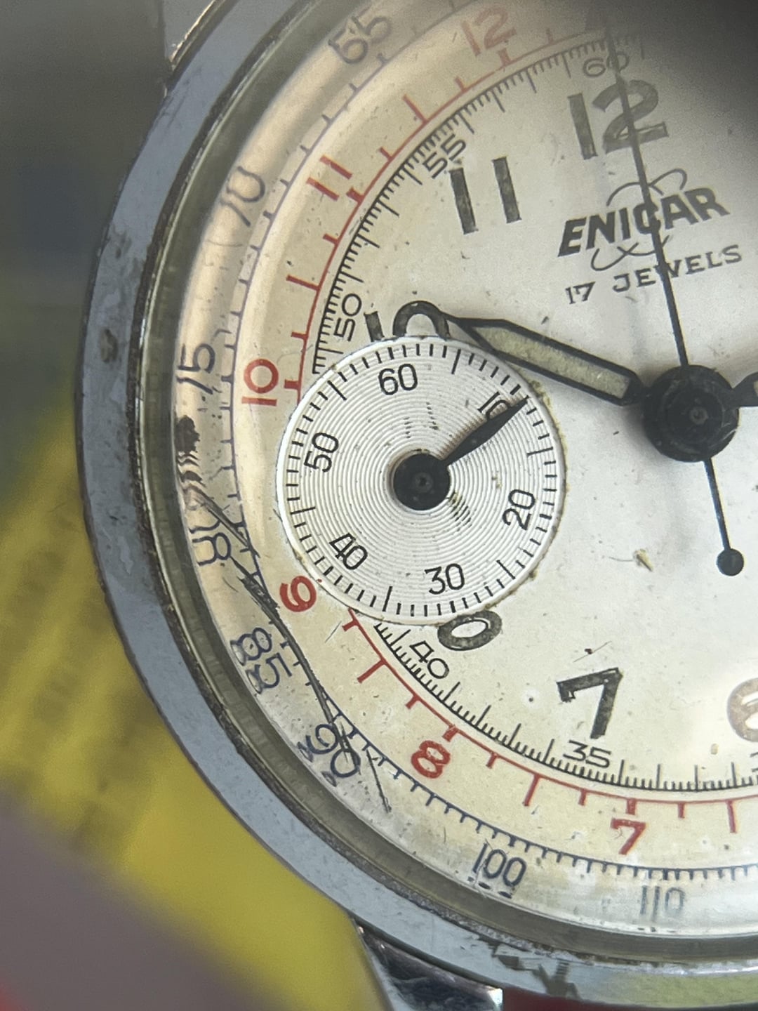 Hi, looking to sell this Enicar Chronograph. This is a very special vintage watch, dating to around 1950. The dial has aged into this gorgeous yellow cream color and really accentuates the red telemeter. Not sure if this was serviced recently but it runs better than any other watch I have of a similar age, it gets about +- 1min a day. Chronograph works like a charm. Watch will ship with a generic strap. Everything has been checked out and deemed all original, movement is Valjoux. Please reach out if you want to see this or any other watch over FaceTime. See all pictures for details and timestamp. Feel free to message, comment, or PM me any questions you may have. Shipping is included in the United States. I accept most forms of major payment. For more vintage watches and first dibs on affordable pieces follow my Instagram at: [Ar.ro.ws](http://ar.ro.ws/)