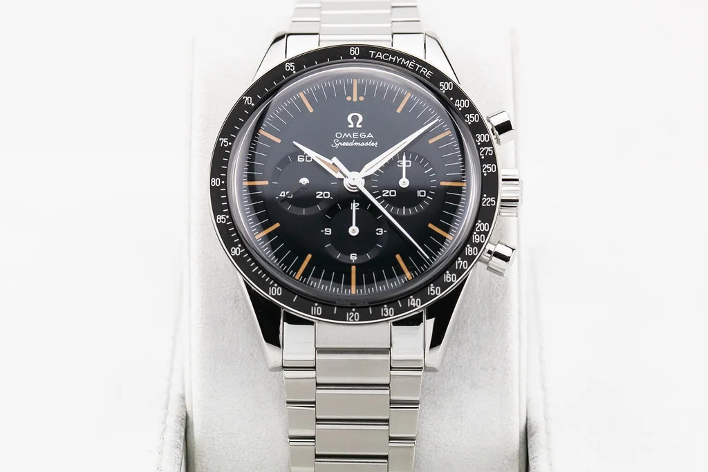 Up for sale is a brand new Omega Speedmaster 3861 Anniversary Series 39.7mm First Omega in Space ( FOIS ), reference # 310.30.40.50.06.001. It comes complete with all boxes, papers, booklets, hang tag, and Omega Warranty Card dated June 2025.