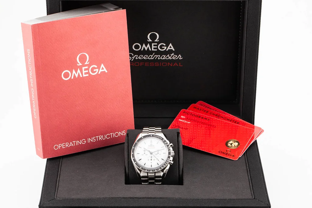 Up for sale is an excellent condition Omega Speedmaster Moonwatch Professional White Dial Sapphire on Bracelet, reference # 310.30.42.50.04.001 It comes with all boxes, papers, booklets and Omega Warranty Card dated January 2025.
