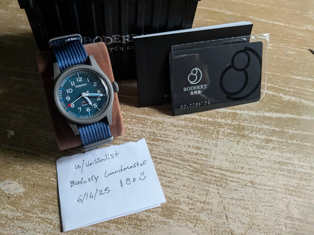 For sale is the mighty Boderry Landmaster in blue. Best field watch for the money imho. Titanium case, sapphire crystal, NH35, best of all: $80 shipped CONUS. Includes box, documentation and warranty.