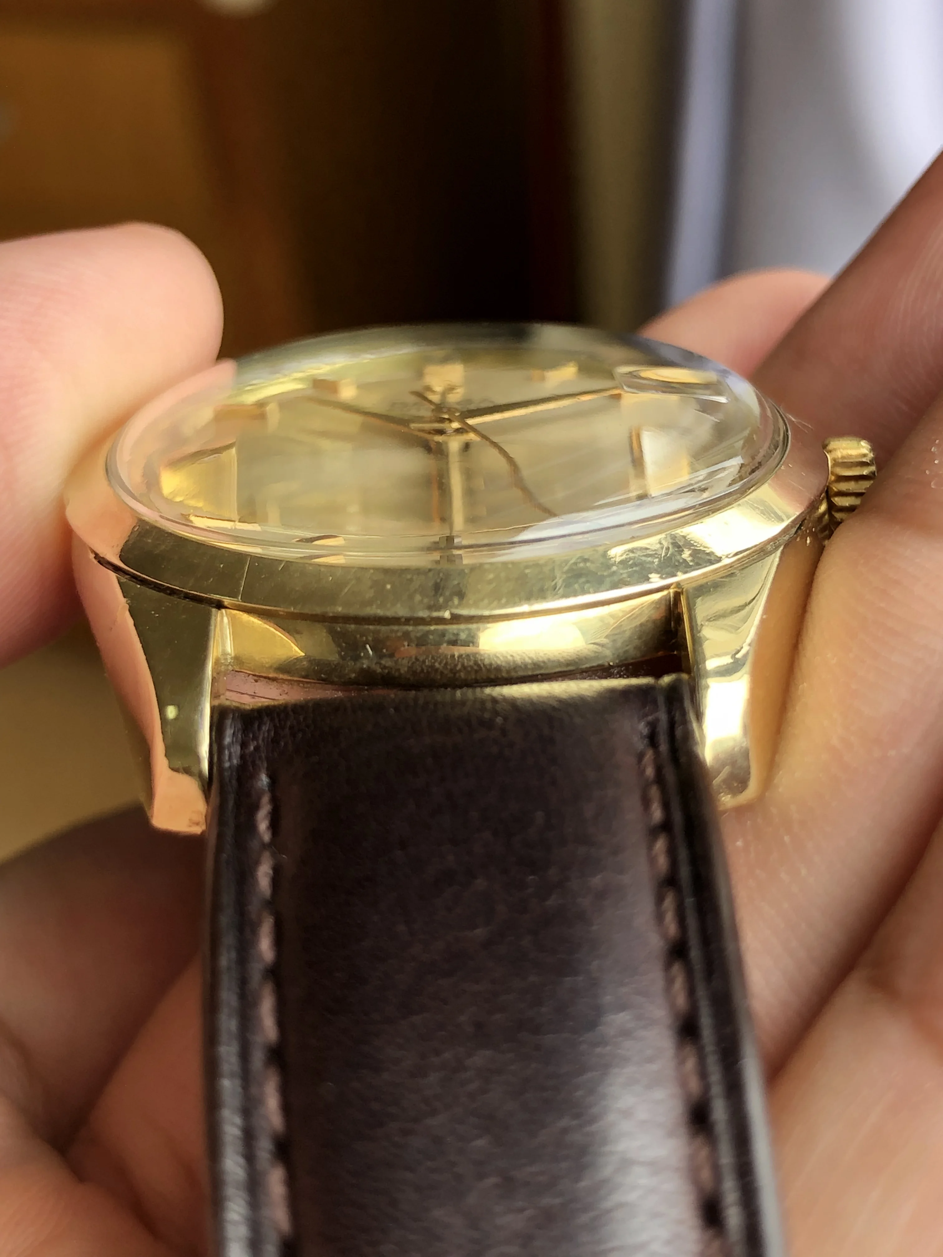 - Dial: Original white sunburst dial with cross hair, solid hands and hour markers (no lume, no paint, no onyx); faceted date-aperture frame at 3; dauphine hands; prints, hands and hour markers are all good.