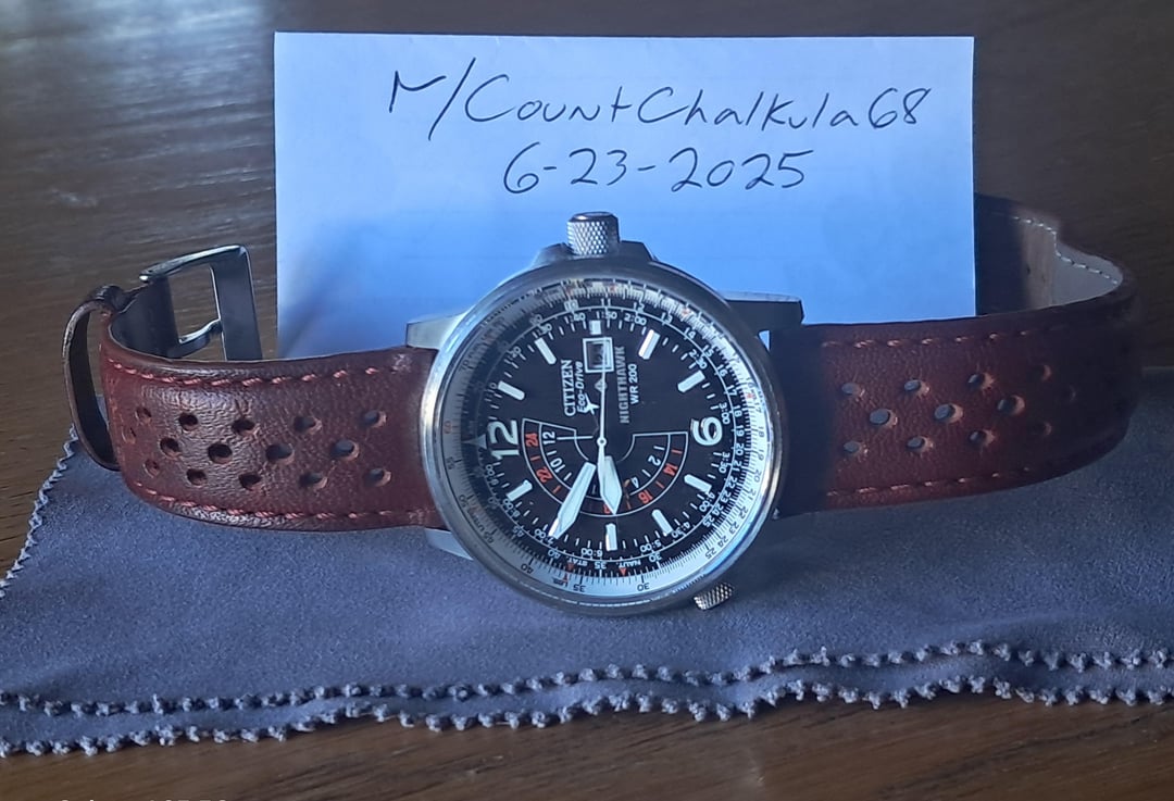 Citizen Nighthawk with white chapter ring and sapphire crystal upgrades. SS mesh bracelet with extra links, and 22mm Barton red horween leather rally strap. QR code manual on box. Full kit available. Mods were done by a former watch maker, not myself. 350 US 🚢. Can provide more pics. Any other questions, please feel free to ask. Thank you for your time.