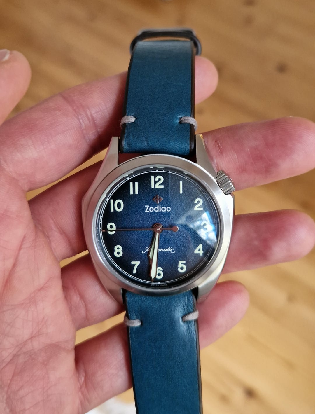 The slightly larger variant of the classic Zodiac Olympos with 40mm case. Limited W&W colourway with a beautiful blue gradient dial. Comes with 2 straps, the blue leather shown in the pictures and a black leather rally band. Asking price is 600$, but I am open to offers.