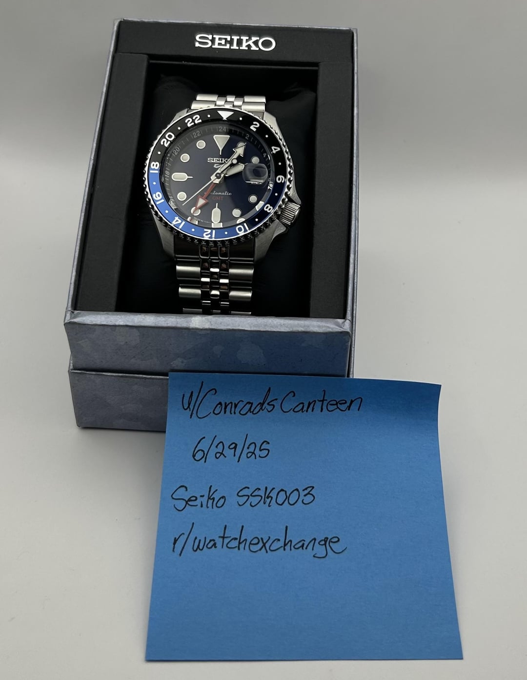 **More Photos:** [https://imgur.com/a/1wNI8p8](https://imgur.com/a/1wNI8p8) **Timestamp Photo:** [https://imgur.com/a/THr6qoi](https://imgur.com/a/THr6qoi) Hey everyone! Up for sale is a beautiful Seiko SSK003. This watch has a rich mixture of polished and brushed surfaces and a super cool black and blue bezel that loves to play with light. In some settings the bezel appears all black, and in others that rich blue really shines through. I purchased this watch new (gray market) in late 2023 and have babied it as I do with all of my watches. **Condition:** Cosmetically, the watch is in overall great shape. There are no scratches to the crystal and no damage to the case or bracelet. Some of the polished surfaces (sides of the watch and sides of the bracelet links and clasp) have some very small, light scuffs, but these are extremely hard to spot. The only noticeable scratches I could find were on the brushed surfaces of the clasp. The watch has kept accurate time since I have owned it. The bezel is also freely able to rotate in both directions, yet it is not loose to where it could accidentally get bumped out of position. I have heard that is a common issue with this model. Overall, this is an excellent, clean example of the SSK003 that still has its whole life ahead of it. Included with the watch is everything it came with. All original bracelet links are included as well as the boxes, the blank warranty card, price/model tag, cushion, and paper for downloading the watch’s manual. I am only selling this watch because my tastes have changed since I purchased it and I just don’t wear it as much anymore. I also am excited to join the Watch Exchange community and build up some transaction history to buy and sell more pieces in the future! **Price/Shipping:** I am asking $250 Shipped Priority Mail (US Only at this time). I am happy to use Paypal Goods & Services for the buyer’s peace of mind. Check me out on eBay for relevant feedback and information about me. I have sold over 1,100 watches of varying values and maintained a high feedback rating. I am happy to answer any more questions you may have and provide more photos as needed! **Watch Specs:** **Size:** Thickness: 13.6mm Diameter: 42.5mm Lug-to-lug: 46mm **Movement:** Caliber 4R34 Automatic Movement (Manual Wind/Automatic) **Crystal:** Hardlex **Water Resistance:** 10 BAR **Official link to Seiko’s product page for more information:** [https://www.seikowatches.com/us-en/products/5sports/ssk003](https://www.seikowatches.com/us-en/products/5sports/ssk003)