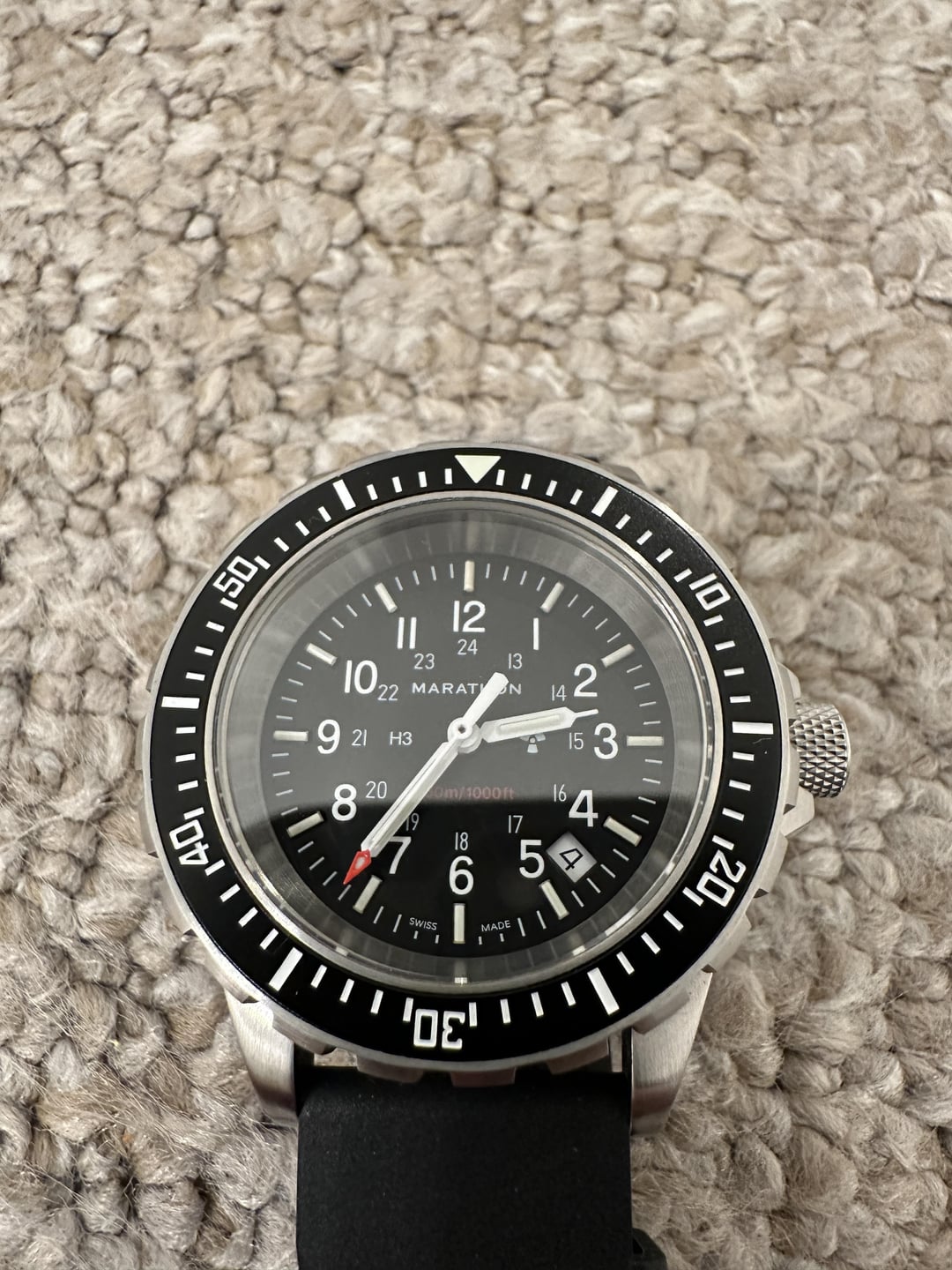 Selling my Marathon Tritium Search and Rescue (TSAR). The TSAR is the GSAR with a Quartz movement. Also Includes Marathon 3-Piece Rubber Strap Kit that ships with the watch. Bought the watch direct from Marathon in Nov 2024 so it still has a little over a year on the factory warranty. Also including the Islander BRAC-90 bracelet that fits this and the 41mm GSAR at no charge. Also including the hat I got from Marathon with purchase, which does not fit my rather large head lol.  Selling because I don’t find the watch comfortable personally and to make room in my collection for a new one. Everything works as it should, the watch is in great condition. I have not worn it much. Asking $800 shipped. Will ship USPS  Would discuss a trade for a Mido Oceanstar 200m black dial on bracelet. Payment via venmo or paypal G&S Thanks!