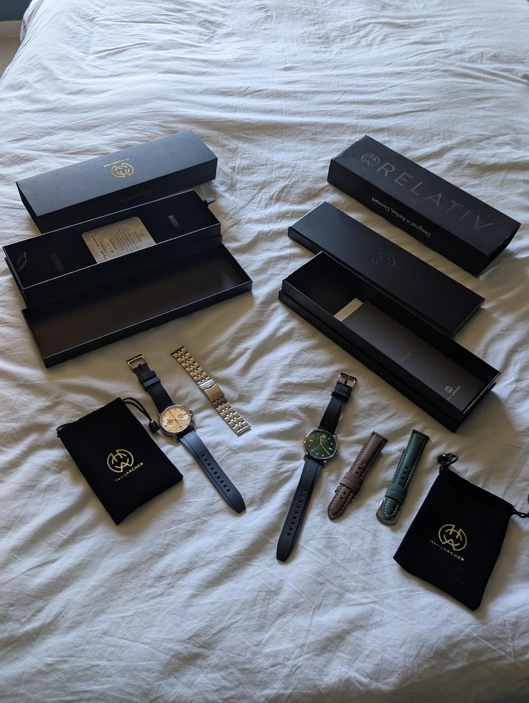 Paring down my collection and letting a few pieces go. Selling a pair of Henry Archers, both early discontinued models in great shape that don't get much wear, either individually or ideally as a pair. Each watch includes extra bands. First up is the Kvantum chronograph, powered by the Seiko VK64 in silver. Size is 41 mm and it includes the original blue HA rubber strap and a bonus HA metal bracelet. Second is the Relativ, powered by the Ronda 715, 40 mm in diameter with the original black HA rubber strap plus a bonus unused green leather HA strap and a used brown HA leather strap. Asking $140 OBO for each and take both for $230. Payment via PayPal or Zelle only, shipping in CONUS included in the price.