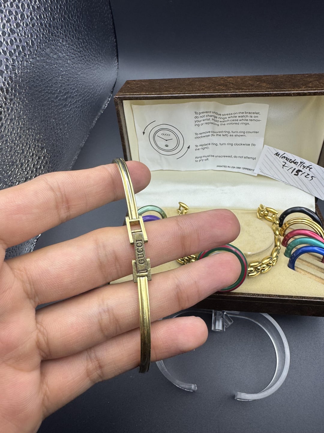 Selling a nice example gucci 11/12 interchangeable bezel watch, very nice working condition with new battery and new glass without scratches installed. Comes with complete bezel set as shown in the box, colors can be exchanged or added, pm me for options. This example has both styles of band included— the rice beads bracelet and the bangle. This set also includes premium bezels, the gucci iconic red/green on the watch and a gold in the bezel set. Asking $825 shipped within USA for this set, price can reduce if only want one style of bracelet or different bezel colors. I have more of this model, bangle style, marina style, and many bezels for this watch if anyone is interested please message me!