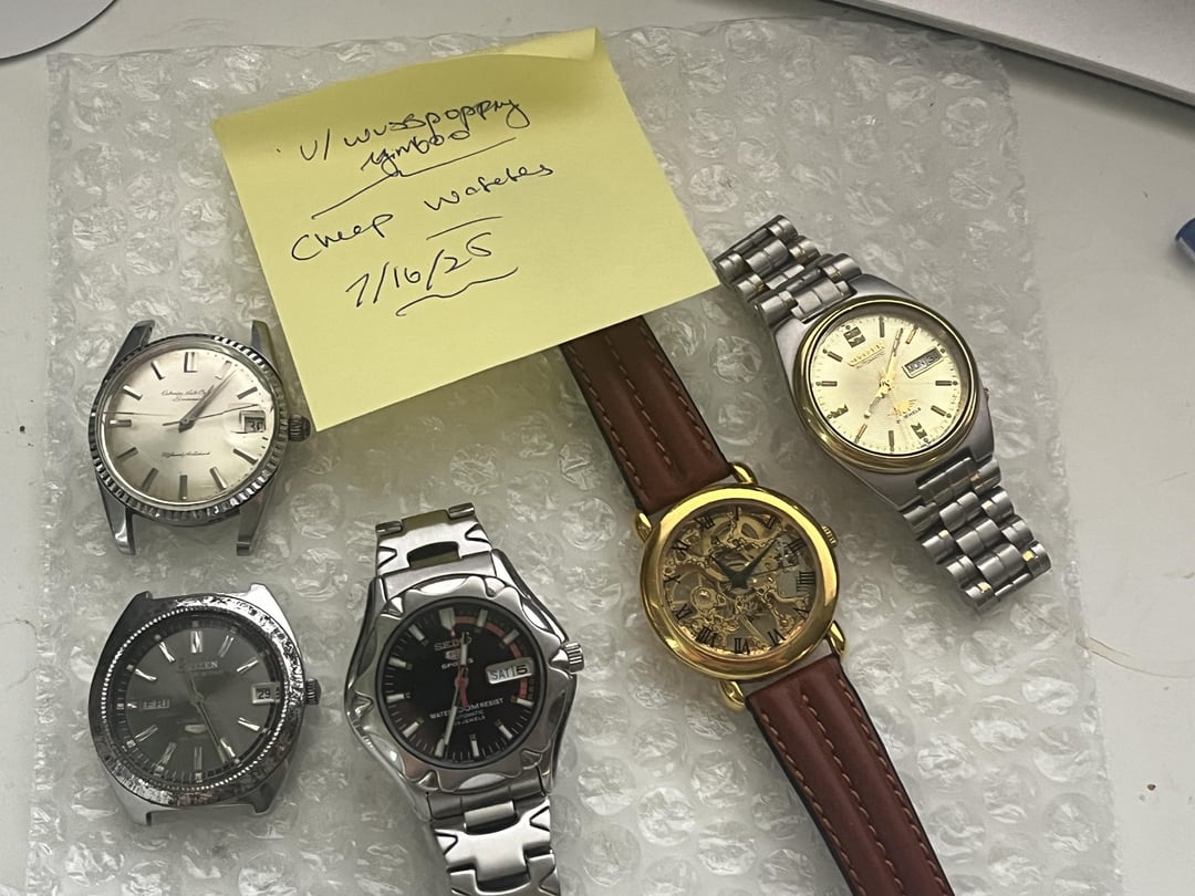 Good evening Watchexchange. I'm moving soon so I have to downsize my collection, including the cheap stuff I've purchased over the years. All watches's prices are in USD + include priority shipping in the US. All the watches are around 38-40mm in diameter. Funky Citizen Seven Star with a split day date. Watch is powered by the citizen automatic caliber 5270. Has winding but no quickset for the day (or hacking). Beautiful burst dial, would make a great beater. - 65 USD Good 'ol reliable Citizen 8200 automatic, overpolished, pretty ugly, but works great. Interesting yellow dial, watch has a spanish/english day. Another great beater watch or a gift for someone who you really don't like. - 40 USD Seiko 5 sports SNZ449, 7S36, automatic, cool racer dial. Caseback has a crack on it (oops), missing diver clasp. rare model though, another beater. - 65 USD Orient Calendar Auto Orient Swimmer (mouthful, I know.). Bargain baller datejust on a budget, acrylic crystal has a crack, interesting burst dial (that makes my eyes hurt in the sun), crown is loose-ish?, automatic, has winding, no quickset though... (ouch) - 70 USD Santo Joannes Manual Wind Skeleton Watch. 18k plated, weird chinese movement, works alright but ticks louder than a zombie from any zombie game - 40 USD Happy to send more pictures/more details about each watch.