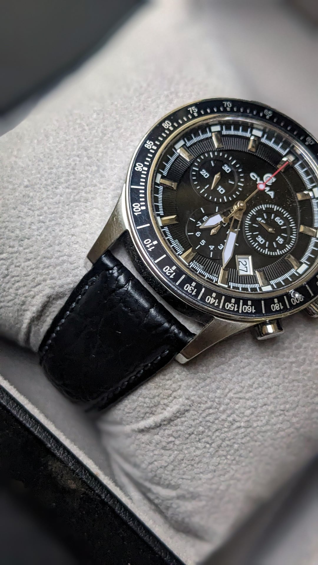 Hello WatchFam, Here's a very special Cyma Champion Chronograph 02-0598A, a sophisticated Swiss-made timepiece that combines robust construction with classic chronograph functionality. This watch features a precise Swiss-made quartz chronograph movement, ensuring accurate timekeeping and reliable performance. The watch comes on a stylish black leather Aftermarket strap, complementing its elegant design. The watch reference number is 02-0598A with a quartz chronograph movement. This timepiece boasts a stunning black dial with contrasting sub-dials for chronograph functions, applied indices, and a date complication at the 6 o'clock position. The outer bezel features a practical tachymeter scale, adding to its sporty appeal. The caseback clearly indicates its Swiss origin from Le Locle, its 316L stainless steel construction, and a durable sapphire crystal. It's a robust watch with a water resistance of 100 meters (WR 100M), making it suitable for everyday wear and various activities. Condition: As shown in the pictures. ✅ Comment before sending dm Timestamp: https://imgur.com/a/rEkq3hG Price $520