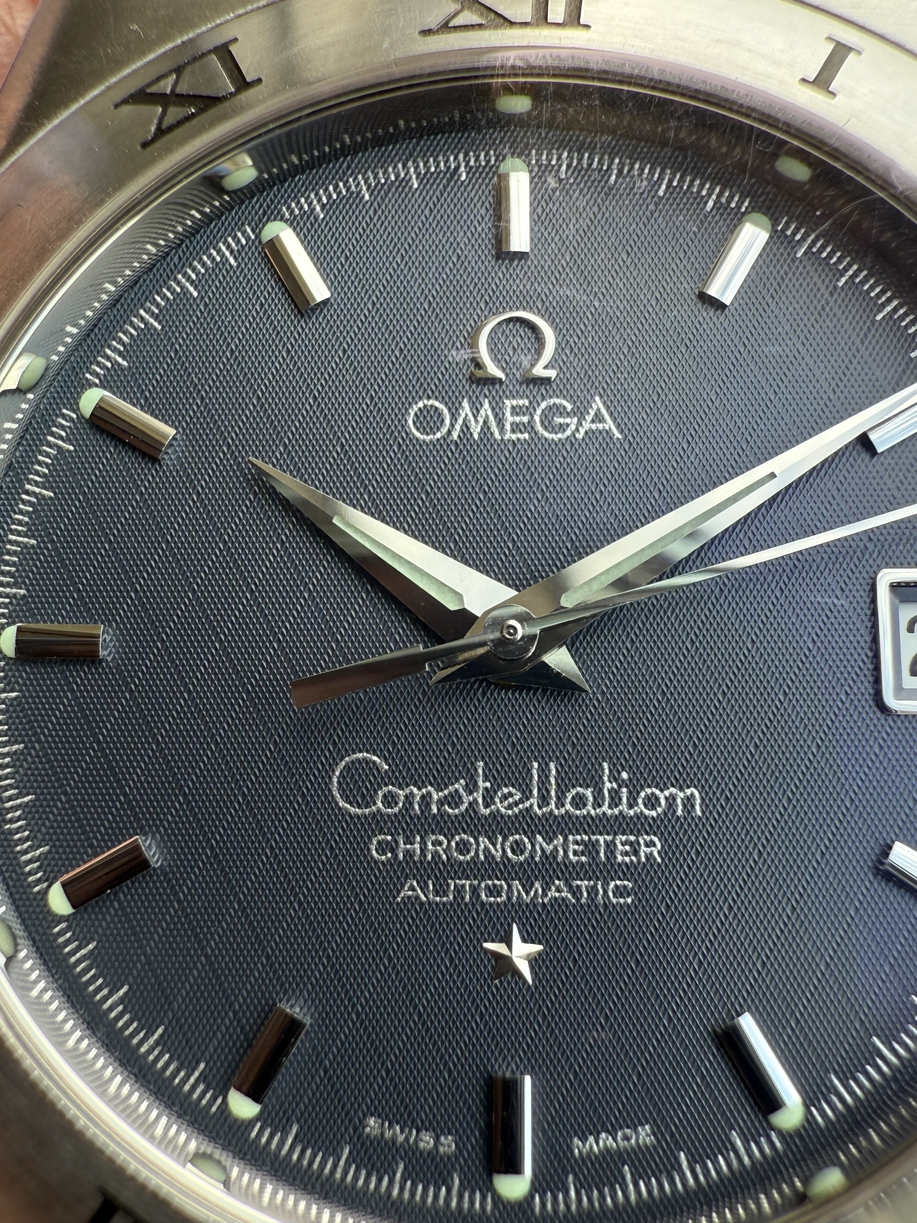 - Dial: Original grey diamond embossed pattern dial in very good condition, applied bation hour markers with lume; applied Omega logo; dauphine hands; date window at 3; prints, hands, hour markers and lume are all good.